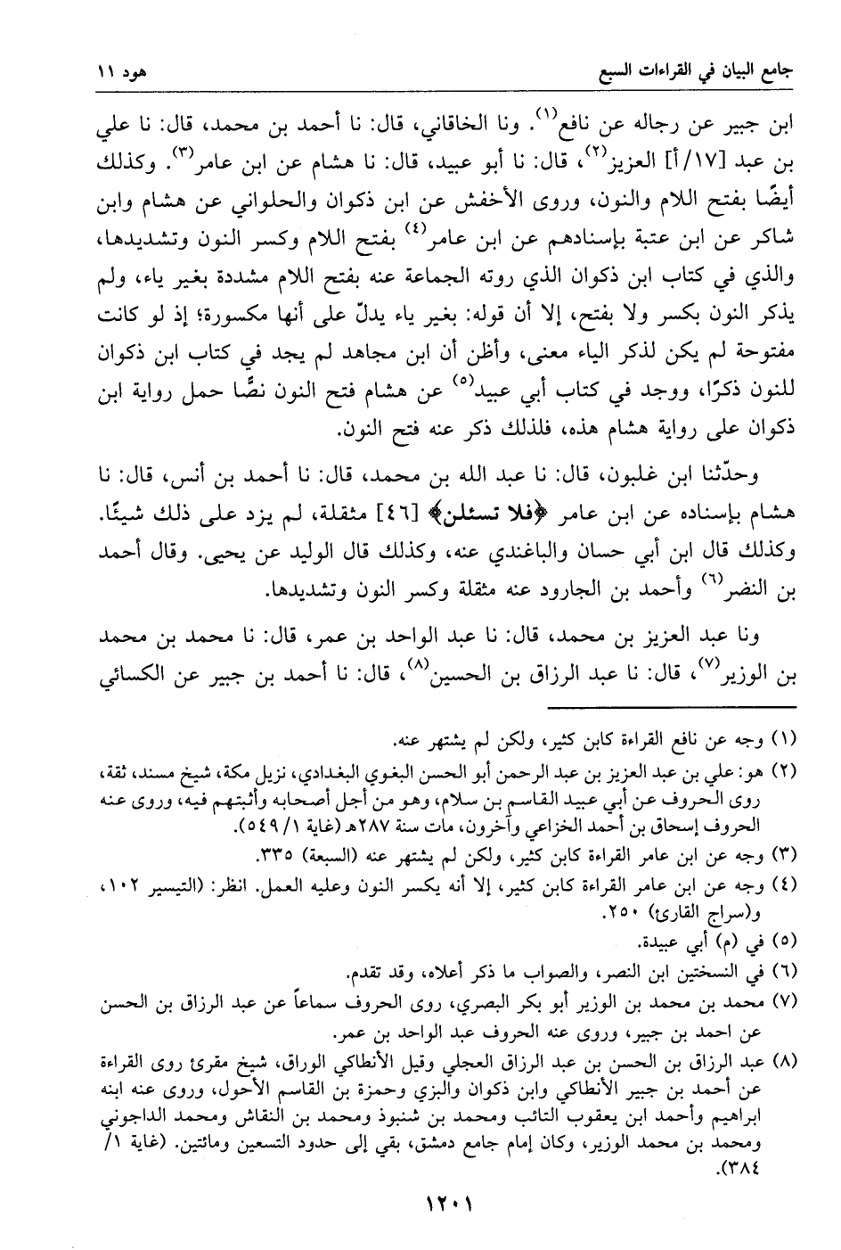 ابن جبير عن رجاله عن نافع «1». ونا الخاقاني، قال: نا أحمد بن محمد، قال: نا علي بن عبد [17/ أ] العزيز «2»، قال: نا أبو عبيد، قال: نا هشام عن ابن عامر «3». وكذلك أيضا بفتح اللام والنون، وروى الأخفش عن ابن ذكوان والحلواني عن هشام وابن شاكر عن ابن عتبة بإسنادهم عن ابن عامر «4» بفتح اللام وكسر النون وتشديدها، والذي في كتاب ابن ذكوان الذي روته الجماعة عنه بفتح اللام مشددة بغير ياء، ولم يذكر النون بكسر ولا بفتح، إلا أن قوله: بغير ياء يدلّ على أنها مكسورة؛ إذ لو كانت مفتوحة لم يكن لذكر الياء معنى، وأظن أن ابن مجاهد لم يجد في كتاب ابن ذكوان للنون ذكرا، ووجد في كتاب أبي عبيد «5» عن هشام فتح النون نصّا حمل رواية ابن ذكوان على رواية هشام هذه، فلذلك ذكر عنه فتح النون.