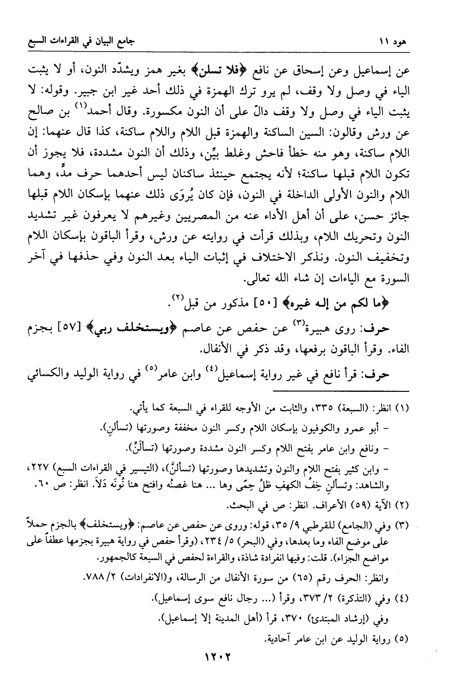 عن إسماعيل وعن إسحاق عن نافع فلا تسلن بغير همز ويشدّد النون، أو لا يثبت الياء في وصل ولا وقف، لم يرو ترك الهمزة في ذلك أحد غير ابن جبير. وقوله: لا يثبت الياء في وصل ولا وقف دالّ على أن النون مكسورة. وقال أحمد «1» بن صالح عن ورش وقالون: السين الساكنة والهمزة قبل اللام واللام ساكنة، كذا قال عنهما: إن اللام ساكنة، وهو منه خطأ فاحش وغلط بيّن، وذلك أن النون مشددة، فلا يجوز أن تكون اللام قبلها ساكنة؛ لأنه يجتمع حينئذ ساكنان ليس أحدهما حرف مدّ، وهما اللام والنون الأولى الداخلة في النون، فإن كان يروى ذلك عنهما بإسكان اللام قبلها جائز حسن، على أن أهل الأداء عنه من المصريين وغيرهم لا يعرفون غير تشديد النون وتحريك اللام، وبذلك قرأت في روايته عن ورش، وقرأ الباقون بإسكان اللام وتخفيف النون. ونذكر الاختلاف في إثبات الياء بعد النون وفي حذفها في آخر السورة مع الياءات إن شاء الله تعالى.