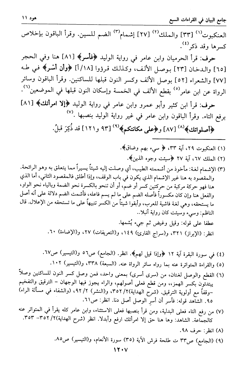 (7) من رفع التاء فعلى البدلية، ومن قرأ بنصبها فعلى الاستثناء، وابن عامر كله يقرأ في المتواتر عنه كالجماعة. الشاهد: وهاهنا حق إلا امرأتك ارفع وأبدلا. انظر (شرح الهداية) 2/ 352 - 353.
