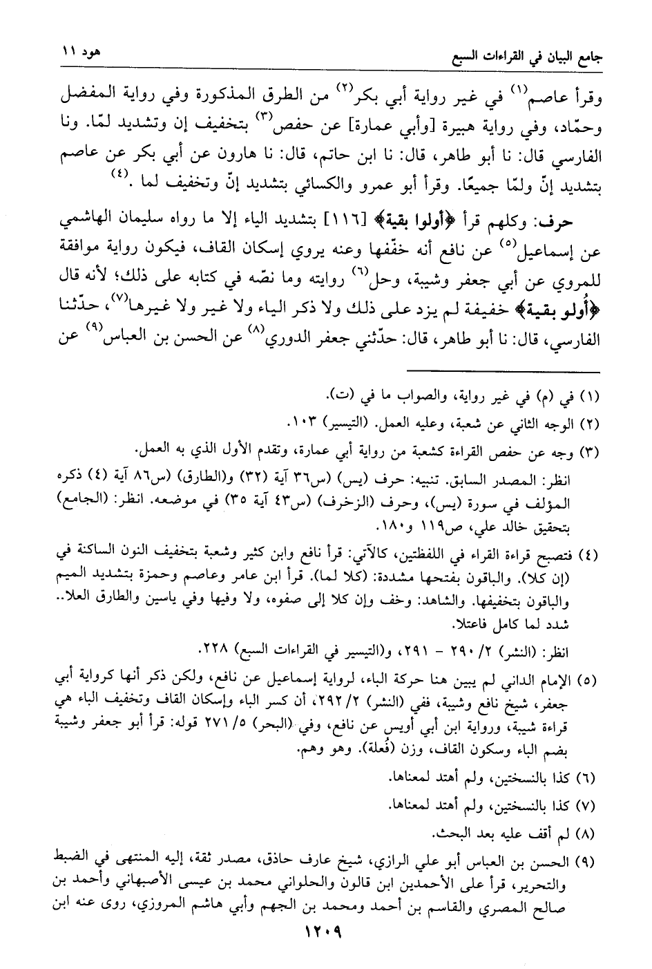 وكلهم قرأ أولوا بقية [116] بتشديد الياء إلا ما رواه سليمان الهاشمي عن إسماعيل «5» عن نافع أنه خفّفها وعنه يروي إسكان القاف، فيكون رواية موافقة للمروي عن أبي جعفر وشيبة، وحل «6» روايته وما نصّه في كتابه على ذلك؛ لأنه قال أولوا بقية خفيفة لم يزد على ذلك ولا ذكر الياء ولا غير ولا غيرها «7»، حدّثنا الفارسي، قال: نا أبو طاهر، قال: حدّثني جعفر الدوري «8» عن الحسن بن العباس «9» عن
