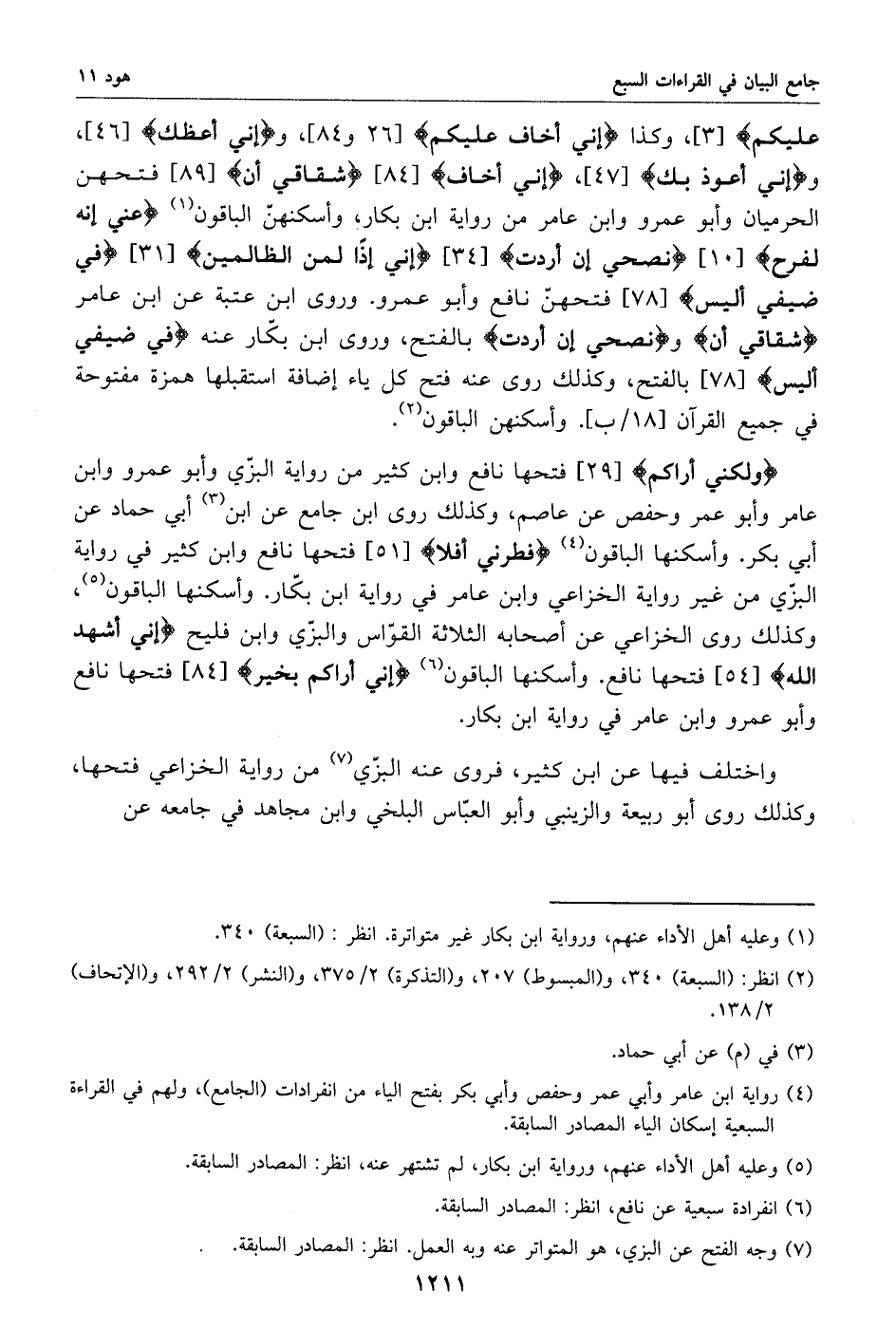 عليكم [3]، وكذا إني أخاف عليكم [26 و 84]، وإني أعظك [46]، وإني أعوذ بك [47]، إني أخاف [84] شقاقي أن [89] فتحهن الحرميان وأبو عمرو وابن عامر من رواية ابن بكار، وأسكنهنّ الباقون «1» عني إنه لفرح [10] نصحي إن أردت [34] إني إذا لمن الظالمين [31] في ضيفي أليس [78] فتحهنّ نافع وأبو عمرو. وروى ابن عتبة عن ابن عامر شقاقي أن ونصحي إن أردت بالفتح، وروى ابن بكّار عنه في ضيفي أليس [78] بالفتح، وكذلك روى عنه فتح كل ياء إضافة استقبلها همزة مفتوحة في جميع القرآن