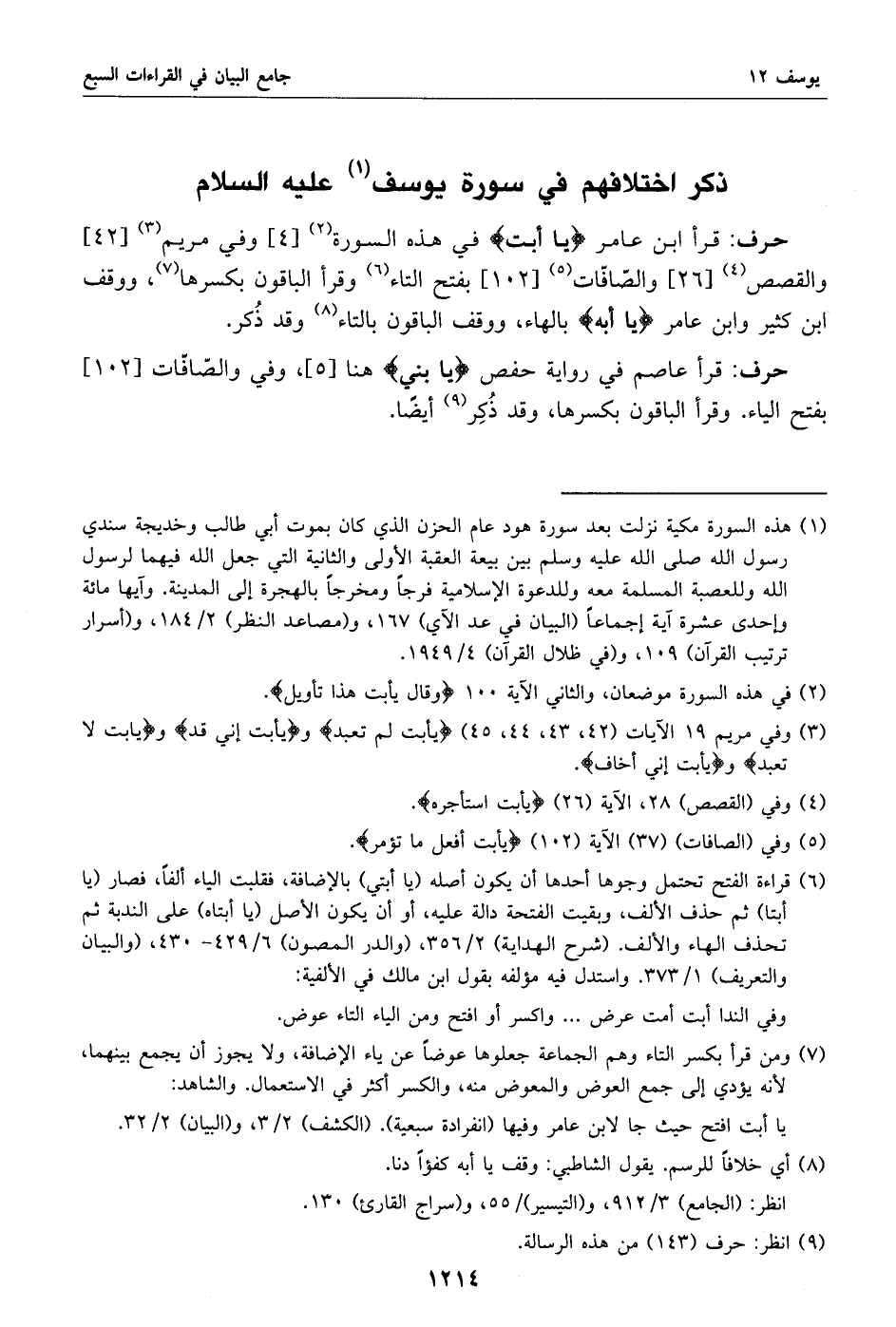 (6) قراءة الفتح تحتمل وجوها أحدها أن يكون أصله (يا أبتي) بالإضافة، فقلبت الياء ألفا، فصار (يا أبتا) ثم حذف الألف، وبقيت الفتحة دالة عليه، أو أن يكون الأصل (يا أبتاه) على الندبة ثم تحذف الهاء والألف. (شرح الهداية) 2/ 356، (والدر المصون) 6/ 429 - 430، (والبيان والتعريف) 1/ 373. واستدل فيه مؤلفه بقول ابن مالك في الألفية: