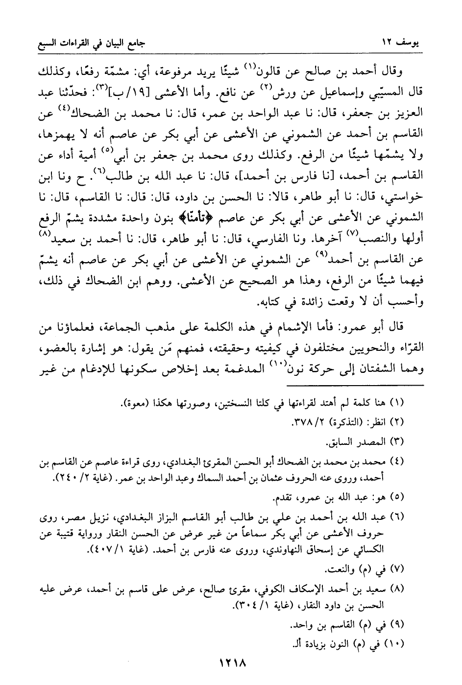 وقال أحمد بن صالح عن قالون «1» شيئا يريد مرفوعة، أي: مشمّة رفعا، وكذلك قال المسيّبي وإسماعيل عن ورش «2» عن نافع. وأما الأعشى [19/ ب] «3»: فحدّثنا عبد العزيز بن جعفر، قال: نا عبد الواحد بن عمر، قال: نا محمد بن الضحاك «4» عن القاسم بن أحمد عن الشموني عن الأعشى عن أبي بكر عن عاصم أنه لا يهمزها، ولا يشمّها شيئا من الرفع. وكذلك روى محمد بن جعفر بن أبي «5» أمية أداء عن القاسم بن أحمد، [نا فارس بن أحمد]، قال: نا عبد الله بن طالب «6». ح ونا ابن خواستي، قال: نا أبو طاهر، قالا: نا الحسن بن داود، قال: قال: نا القاسم، قال: نا الشموني عن الأعشى عن أبي بكر عن عاصم تأمنّا بنون واحدة مشددة يشمّ الرفع أولها والنصب «7» آخرها. ونا الفارسي، قال: نا أبو طاهر، قال: نا أحمد بن سعيد «8» عن القاسم بن أحمد «9» عن الشموني عن الأعشى عن أبي بكر عن عاصم أنه يشمّ فيهما شيئا من الرفع، وهذا هو الصحيح عن الأعشى. ووهم ابن الضحاك في ذلك، وأحسب أن لا وقعت زائدة في كتابه.