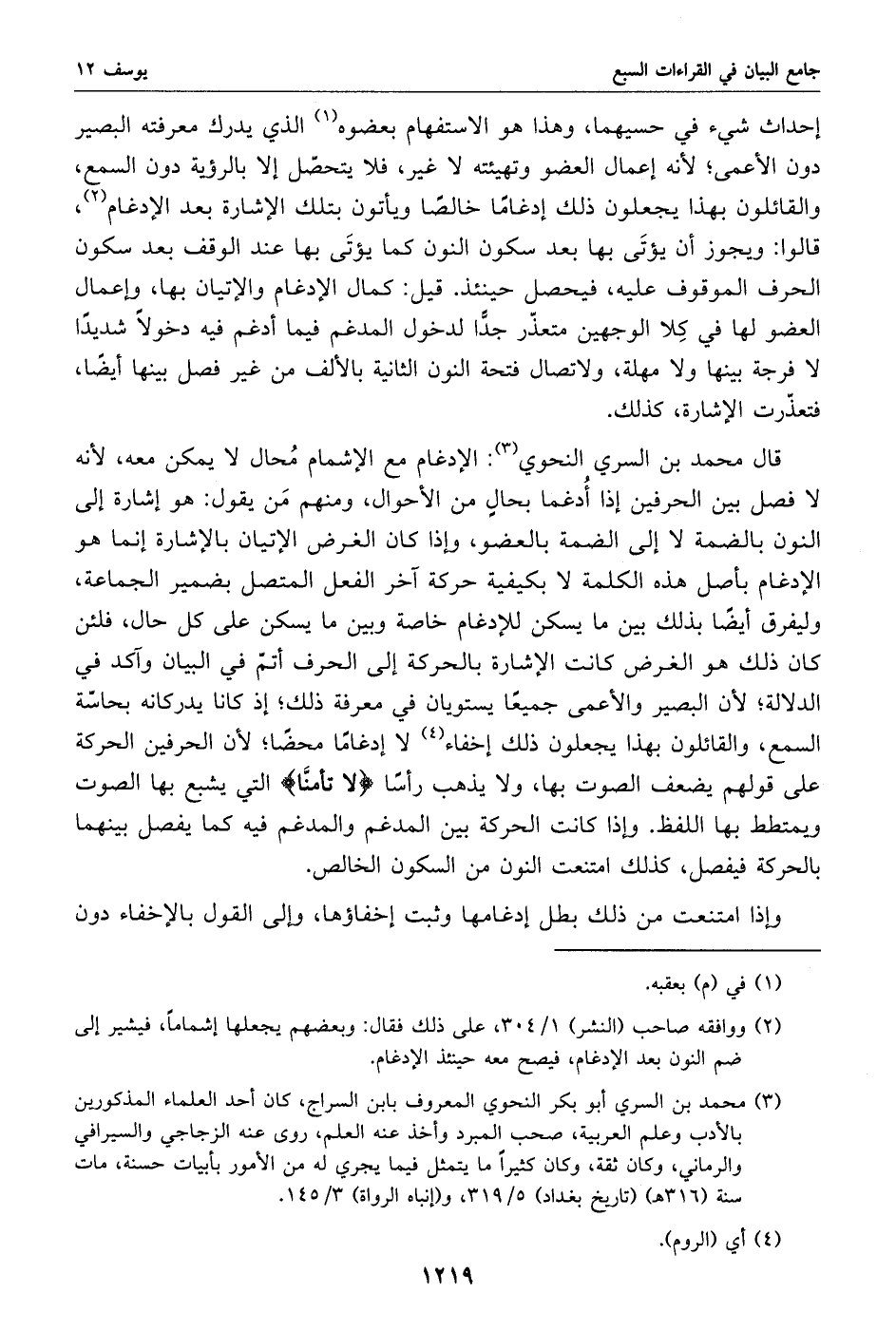 قال محمد بن السري النحوي «3»: الإدغام مع الإشمام محال لا يمكن معه، لأنه لا فصل بين الحرفين إذا أدغما بحال من الأحوال، ومنهم من يقول: هو إشارة إلى النون بالضمة لا إلى الضمة بالعضو، وإذا كان الغرض الإتيان بالإشارة إنما هو الإدغام بأصل هذه الكلمة لا بكيفية حركة آخر الفعل المتصل بضمير الجماعة، وليفرق أيضا بذلك بين ما يسكن للإدغام خاصة وبين ما يسكن على كل حال، فلئن كان ذلك هو الغرض كانت الإشارة بالحركة إلى الحرف أتمّ في البيان وآكد في الدلالة؛ لأن البصير والأعمى جميعا يستويان في معرفة ذلك؛ إذ كانا يدركانه بحاسّة السمع، والقائلون بهذا يجعلون ذلك إخفاء «4» لا إدغاما محضا؛ لأن الحرفين الحركة على قولهم يضعف الصوت بها، ولا يذهب رأسا لا تأمنّا التي يشبع بها الصوت ويمتطط بها اللفظ. وإذا كانت الحركة بين المدغم والمدغم فيه كما يفصل بينهما بالحركة فيفصل، كذلك امتنعت النون من السكون الخالص.