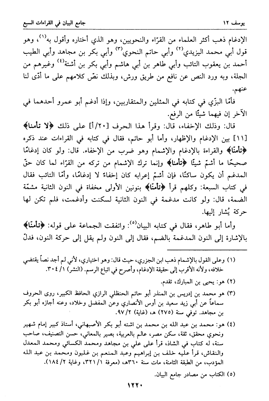 وأما أبو طاهر، فقال في كتابه البيان «5»: واتفقت الجماعة على قوله: تأمنّا بالإشارة إلى النون المدغمة بالضم، فقال إلى النون ولم يقل إلى حركة النون، فدلّ