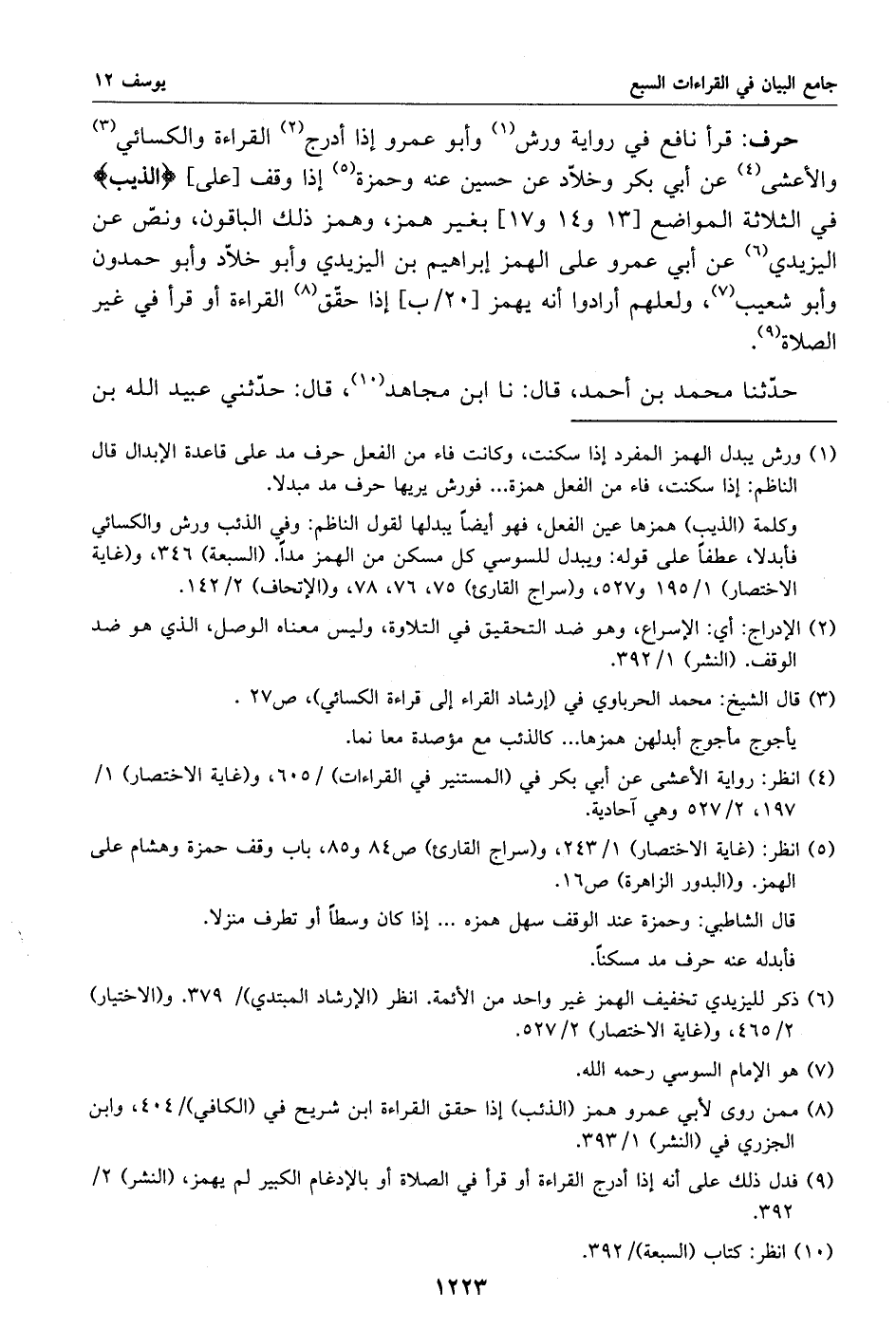 (5) انظر: (غاية الاختصار) 1/ 243، و (سراج القارئ) ص 84 و 85، باب وقف حمزة وهشام على الهمز. و (البدور الزاهرة) ص 16.