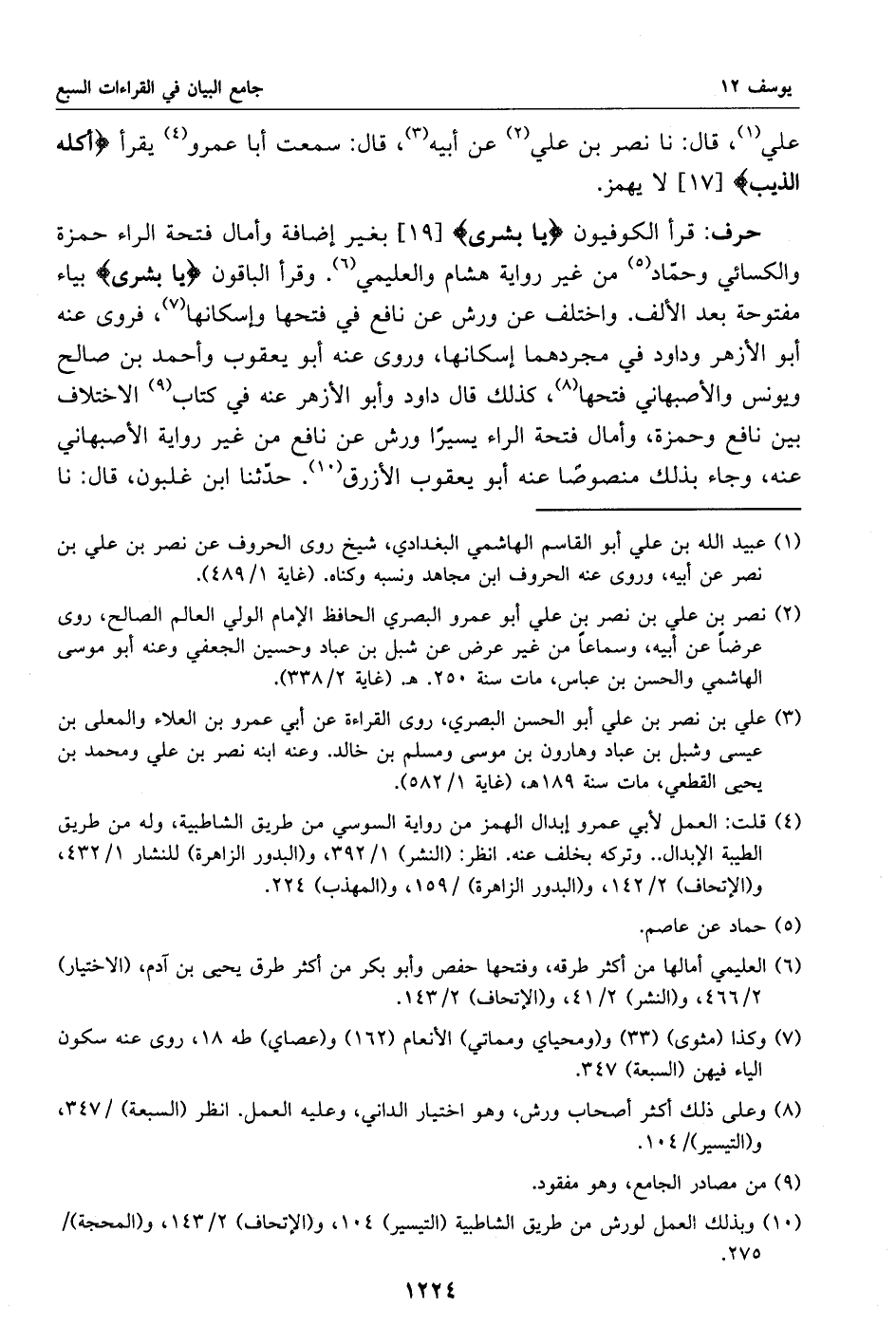 (2) نصر بن علي بن نصر بن علي أبو عمرو البصري الحافظ الإمام الولي العالم الصالح، روى عرضا عن أبيه، وسماعا من غير عرض عن شبل بن عباد وحسين الجعفي وعنه أبو موسى الهاشمي والحسن بن عباس، مات سنة 250. هـ. (غاية 2/ 338).
