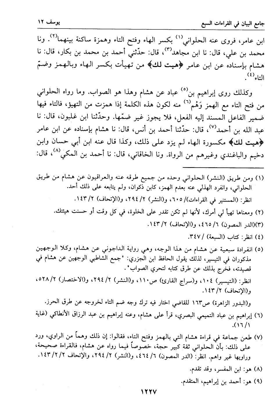 وكذلك روى إبراهيم بن «5» عباد عن هشام وهذا هو الصواب. وما رواه الحلواني من فتح التاء مع الهمز وهم «6» منه لكون هذه الكلمة إذا همزت من التهيؤ، فالتاء فيها ضمير الفاعل المسند إليه الفعل، فلا يجوز غير ضمّها. وحدّثنا ابن غلبون، قال: نا عبد الله بن أحمد «7»، قال: حدّثنا أحمد بن أنس، قال: نا هشام بإسناده عن ابن عامر هيت لك مكسورة الهاء لم يزد على ذلك، وكذا قال عنه ابن أبي حسان وابن دخيم والباغندي وغيرهم من الرواة. ونا الخاقاني، قال: نا أحمد بن المكي «8»، قال: