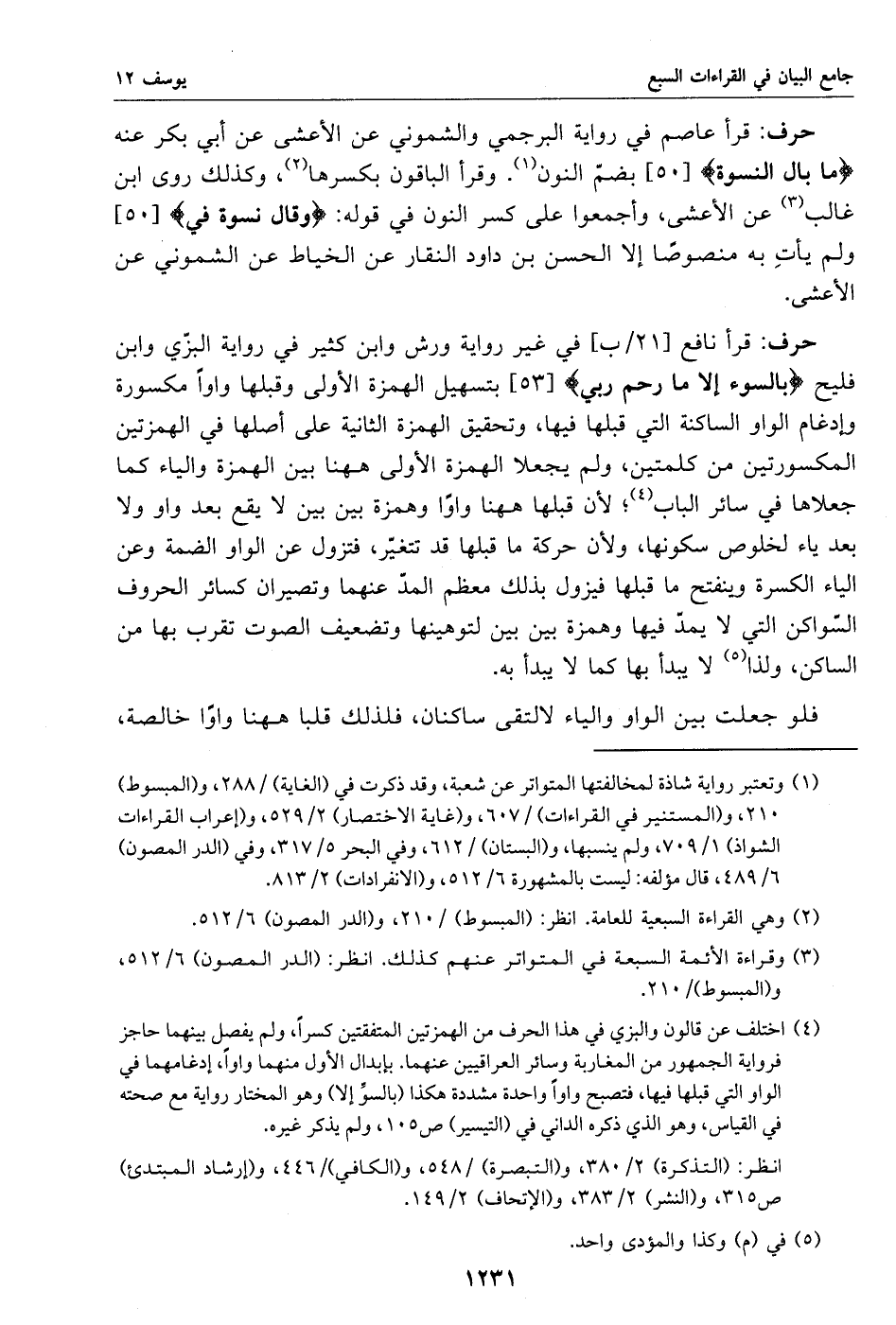 (4) اختلف عن قالون والبزي في هذا الحرف من الهمزتين المتفقتين كسرا، ولم يفصل بينهما حاجز فرواية الجمهور من المغاربة وسائر العراقيين عنهما. بإبدال الأول منهما واوا، إدغامهما في الواو التي قبلها فيها، فتصبح واوا واحدة مشددة هكذا (بالسوّ إلا) وهو المختار رواية مع صحته في القياس، وهو الذي ذكره الداني في (التيسير) ص 105، ولم يذكر غيره.