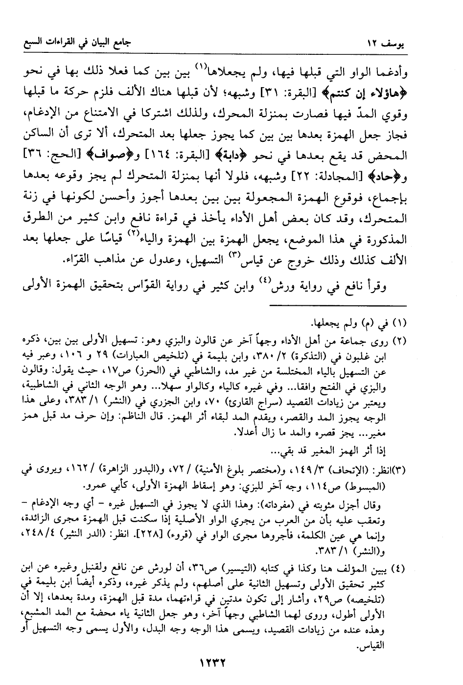 وقال أجزل مثوبته في (مفرداته): وهذا الذي لا يجوز في التسهيل غيره- أي وجه الإدغام- وتعقب عليه بأن من العرب من يجري الواو الأصلية إذا سكنت قبل الهمزة مجرى الزائدة، وإنما هي عين الكلمة، فأجروها مجرى الواو في (قروء) [228]. انظر: (الدر النثير) 4/ 248، و (النشر) 1/ 383.