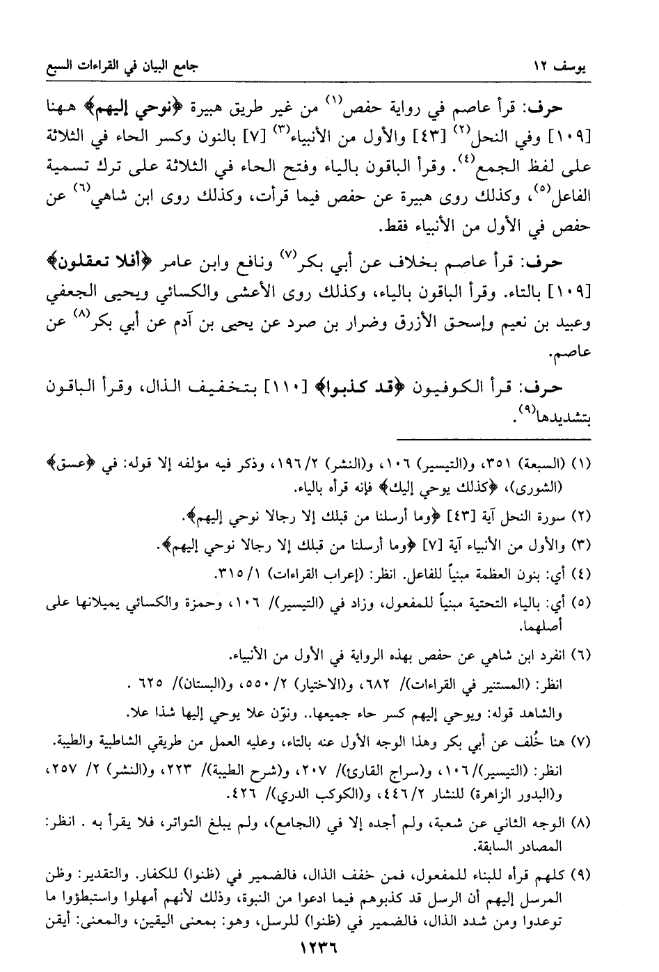 حرف: قرأ عاصم في رواية حفص «1» من غير طريق هبيرة نوحي إليهم هاهنا [109] وفي النحل «2» [43] والأول من الأنبياء «3» [7] بالنون وكسر الحاء في الثلاثة على لفظ الجمع «4». وقرأ الباقون بالياء وفتح الحاء في الثلاثة على ترك تسمية الفاعل «5»، وكذلك روى هبيرة عن حفص فيما قرأت، وكذلك روى ابن شاهي «6» عن حفص في الأول من الأنبياء فقط.