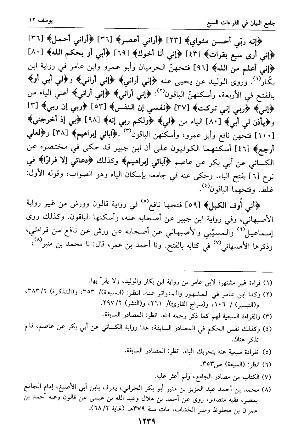 إنه ربّي أحسن مثواي [23] أراني أعصر [36] أراني أحمل [36] إني أرى سبع بقرات [43] إني أنا أخوك [69] أبي أو يحكم الله [80] إني أعلم من الله [96] فتحهنّ الحرميان وأبو عمرو وابن عامر في رواية ابن بكّار «1». وروى الوليد عن يحيى عنه إني أراني إني أراني ولي أبي أو بالفتح في الأربعة، وأسكنهنّ الباقون «2»: إني أراني إني أراني أعني الياء من إني ربي إني تركت [37] نفسي إن النفس [53] ربي إن ربي [3] ويأذن لي أبي [80] الياء من لي ولكم ربي إنه [98] بي إذ أخرجني [100] فتحهن نافع وأبو عمرو، وأسكنهن الباقون «3». آبائي إبراهيم [38] ولعلي أرجع [46] أسكنهما الكوفيون على أن ابن جبير قد حكى في مختصره عن الكسائي عن أبي بكر عن عاصم آبائي إبراهيم وكذلك دعائي إلا فرارا في نوح [6] بفتح الياء. وحكى عنه في جامعه بإسكان الياء وهو الصواب، وقوله الأول: