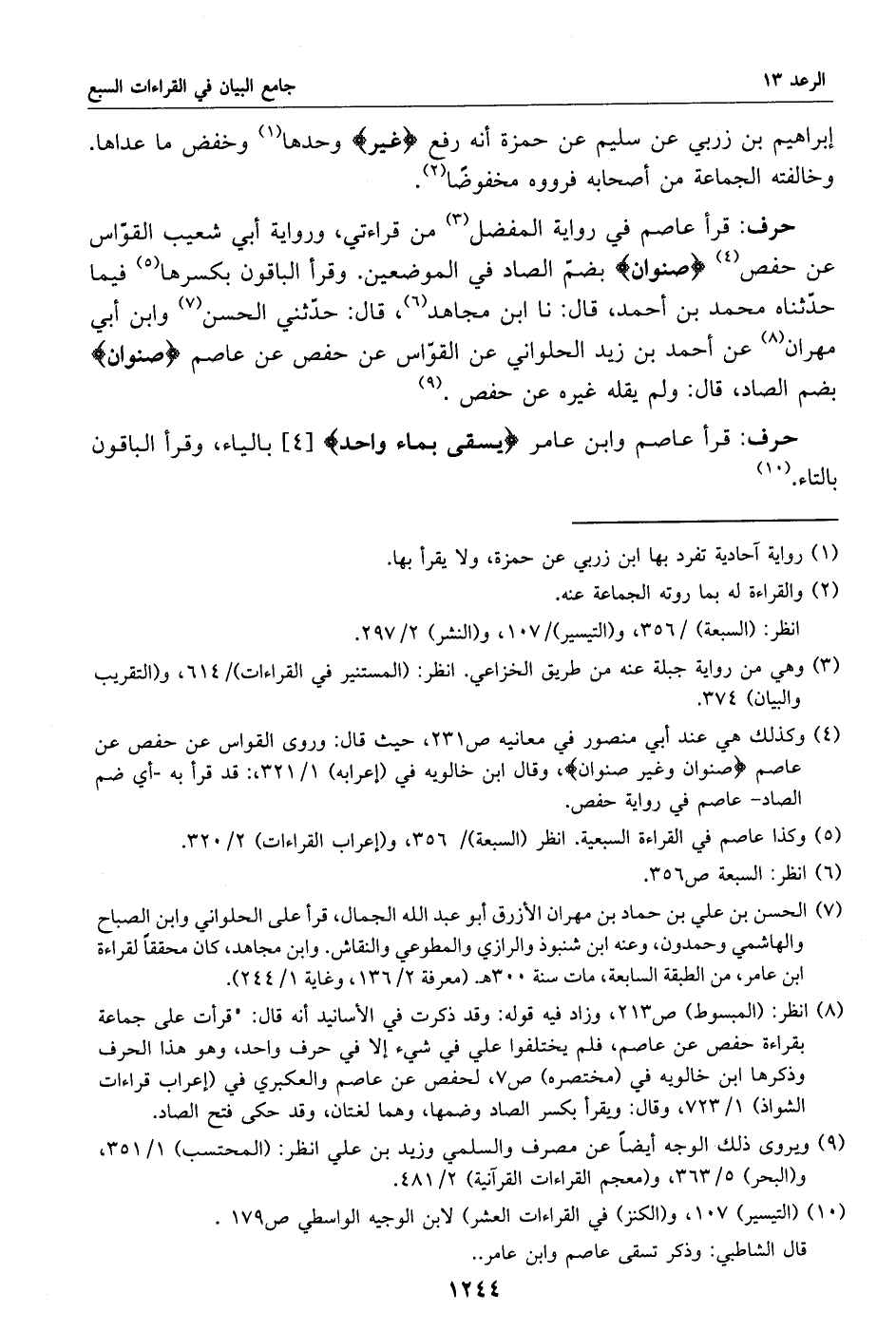 بن أحمد، قال: نا ابن مجاهد «6»، قال: حدّثني الحسن «7» وابن أبي مهران «8» عن أحمد بن زيد الحلواني عن القوّاس عن حفص عن عاصم صنوان بضم الصاد، قال: ولم يقله غيره عن حفص. «9»