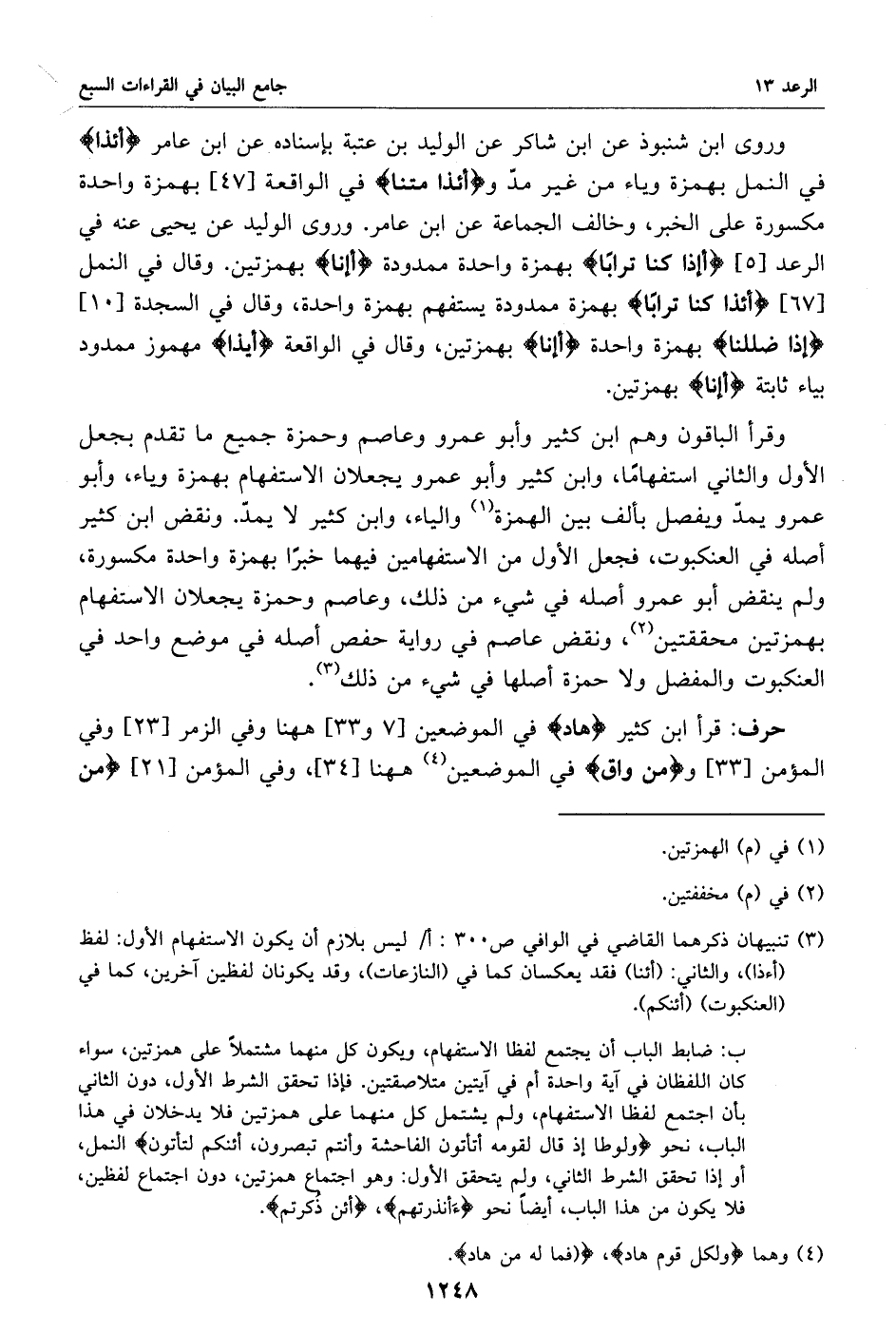 (3) تنبيهان ذكرهما القاضي في الوافي ص 300: أ/ ليس بلازم أن يكون الاستفهام الأول: لفظ (أءذا)، والثاني: (أئنا) فقد يعكسان كما في (النازعات)، وقد يكونان لفظين آخرين، كما في (العنكبوت) (أئنكم).