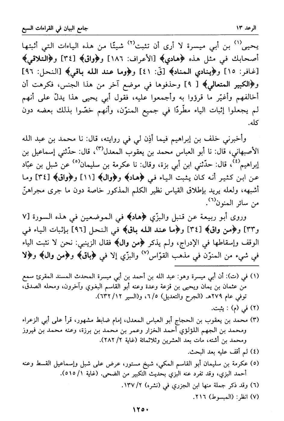 وروى أبو ربيعة عن قنبل والبزّي هاد في الموضعين في هذه السورة [7 و 33] ومن واق [34] وما عند الله باق في النحل [96] بإثبات الياء في الوقف وإسقاطها في الإدراج، ولم يذكر من وال فقال الزينبي: نحن لا نثبت الياء في شيء من المنوّن في مذهب القوّاس «7» والبزّي إلا في باق ومن وال ولا