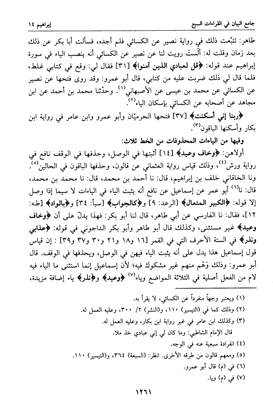 12]، فقال: نا الفارسي عن أبي طاهر، قال لنا أبو بكر: فهذا يدلّ على أن وخاف وعيد غير مستثنى، وكذلك قال أبو طاهر وأبو بكر الداجوني في قوله: عذابي ونذر في الستة الأحرف التي في القمر [16 و 18 و 21 و 30 و 37 و 39]: إن قياس قول إسماعيل هذا يدل على أنه يثبت الياء فيهن في الوصل، ويحذفها في الوقف. قال أبو عمرو: وذلك وهم منهم غير مشكوك فيه؛ لأن إسماعيل إنما استثنى ما الياء فيه لام من الفعل أصلية في الثلاثة المواضع وياء «7» وعيد ونذر ياء إضافة مزيدة،