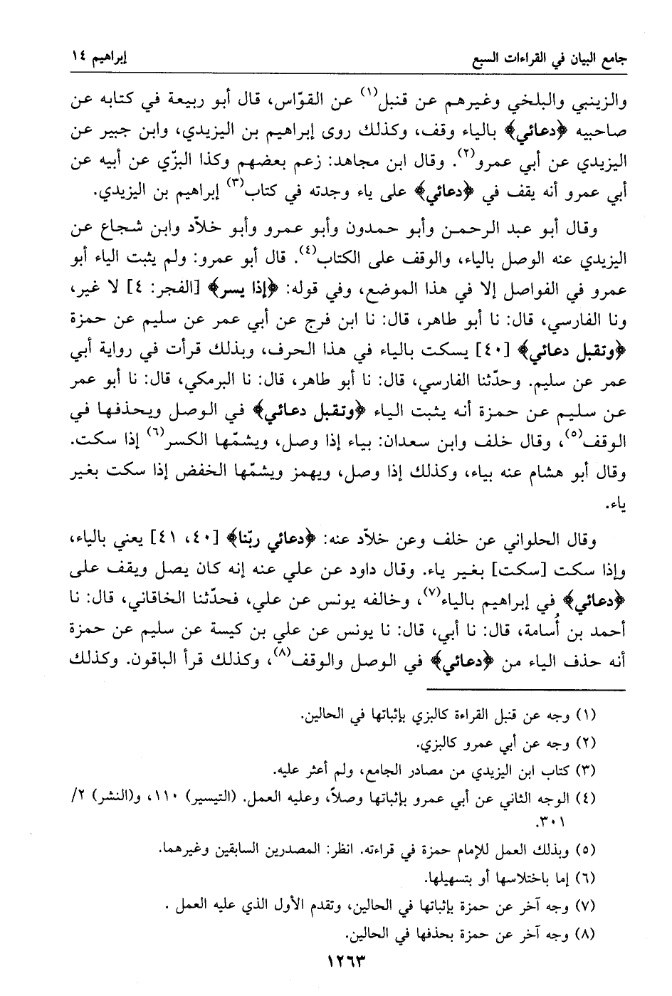 والزينبي والبلخي وغيرهم عن قنبل «1» عن القوّاس، قال أبو ربيعة في كتابه عن صاحبيه دعائي بالياء وقف، وكذلك روى إبراهيم بن اليزيدي، وابن جبير عن اليزيدي عن أبي عمرو «2». وقال ابن مجاهد: زعم بعضهم وكذا البزّي عن أبيه عن أبي عمرو أنه يقف في دعائي على ياء وجدته في كتاب «3» إبراهيم بن اليزيدي.