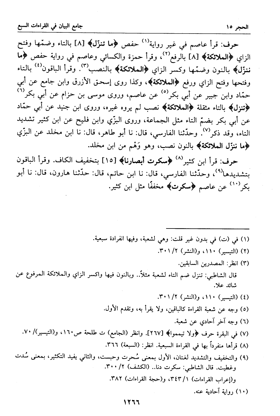 قرأ عاصم في غير رواية «1» حفص ما تنزّل [8] بالتاء وضمّها وفتح الزاي الملائكة [8] بالرفع «2»، وقرأ حمزة والكسائي وعاصم في رواية حفص ما ننزّل بالنون وضمّها وكسر الزاي الملائكة بالنصب «3». وقرأ الباقون «4» بالتاء وفتحها وفتح الزاي ورفع الملائكة، وكذا روى إسحاق الأزرق وابن جامع عن أبي حمّاد وابن جبير عن أبي بكر «5» عن عاصم، وروى موسى بن حزام عن أبي بكر «6» تنزل بالتاء مثقلة الملائكة نصب لم يروه غيره، وروى ابن جنيد عن أبي حمّاد عن أبي بكر بضمّ التاء مثل الجماعة، وروى البزّي وابن فليح عن ابن كثير تشديد التاء، وقد ذكر «7». وحدّثنا الفارسي، قال: نا أبو طاهر، قال: نا ابن مخلد عن البزّي ما ننزّل الملائكة بالنون نصب، وهو وهم من ابن مخلد.