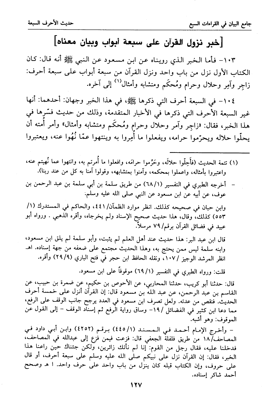 103 - فأما الخبر الذي رويناه عن ابن مسعود عن النبي صلى الله عليه وسلم أنه قال: كان الكتاب الأول نزل من باب واحد ونزل القرآن من سبعة أبواب على سبعة أحرف: