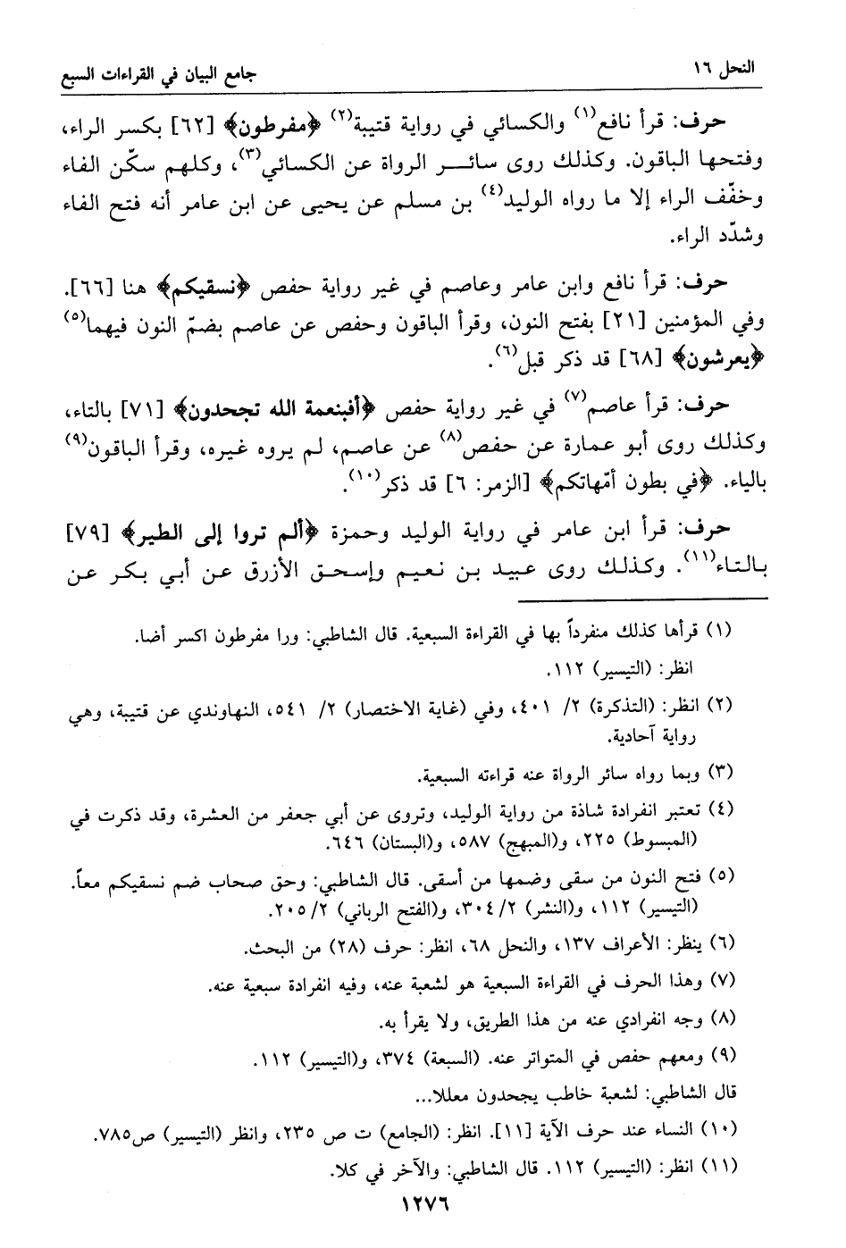 قرأ عاصم «7» في غير رواية حفص أفبنعمة الله تجحدون [71] بالتاء، وكذلك روى أبو عمارة عن حفص «8» عن عاصم، لم يروه غيره، وقرأ الباقون «9» بالياء. في بطون أمّهاتكم [الزمر: 6] قد ذكر «10».