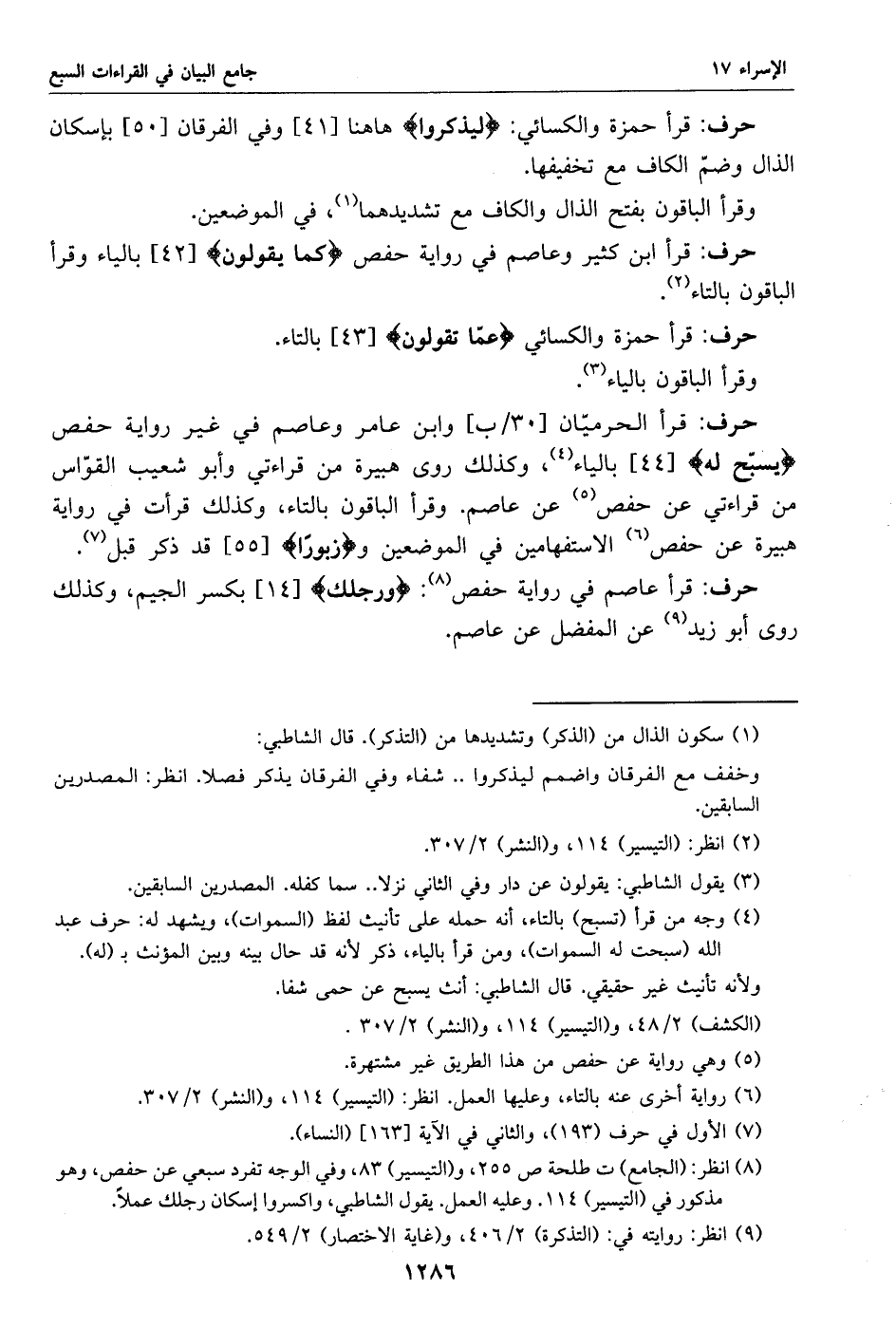 قرأ الحرميّان [30/ ب] وابن عامر وعاصم في غير رواية حفص يسبّح له [44] بالياء «4»، وكذلك روى هبيرة من قراءتي وأبو شعيب القوّاس من قراءتي عن حفص «5» عن عاصم. وقرأ الباقون بالتاء، وكذلك قرأت في رواية هبيرة عن حفص «6» الاستفهامين في الموضعين وزبورا [55] قد ذكر قبل «7».