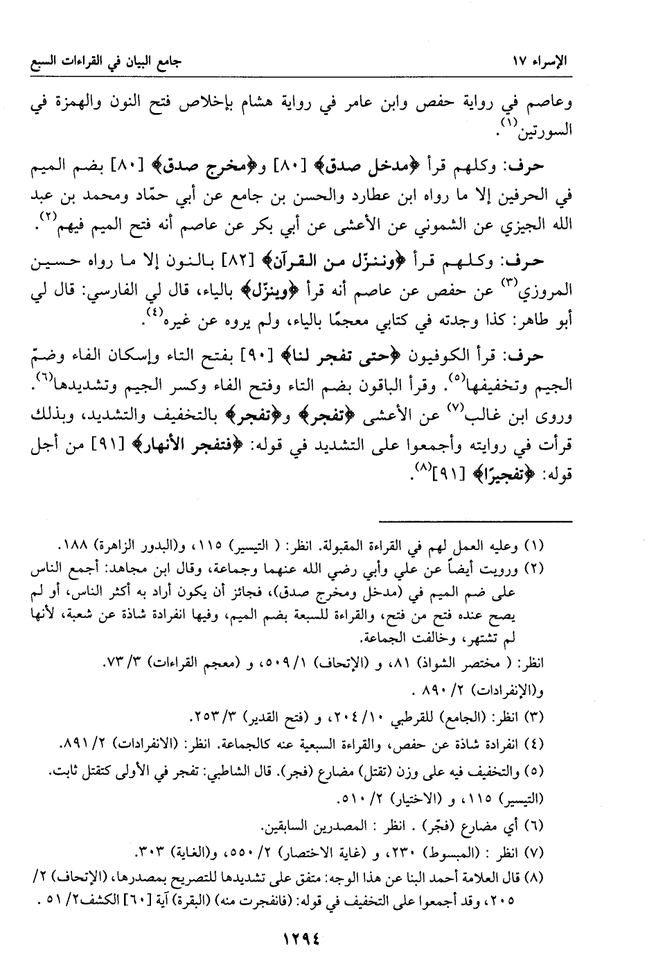 (8) قال العلامة أحمد البنا عن هذا الوجه: متفق على تشديدها للتصريح بمصدرها، (الإتحاف) 2/ 205، وقد أجمعوا على التخفيف في قوله: (فانفجرت منه) (البقرة) آية [60] الكشف 2/ 51.