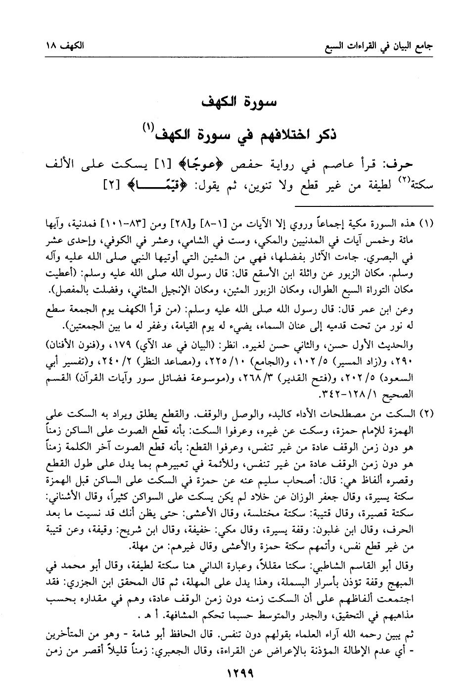 قرأ عاصم في رواية حفص عوجا [1] يسكت على الألف سكتة «2» لطيفة من غير قطع ولا تنوين، ثم يقول: قيّما [2]