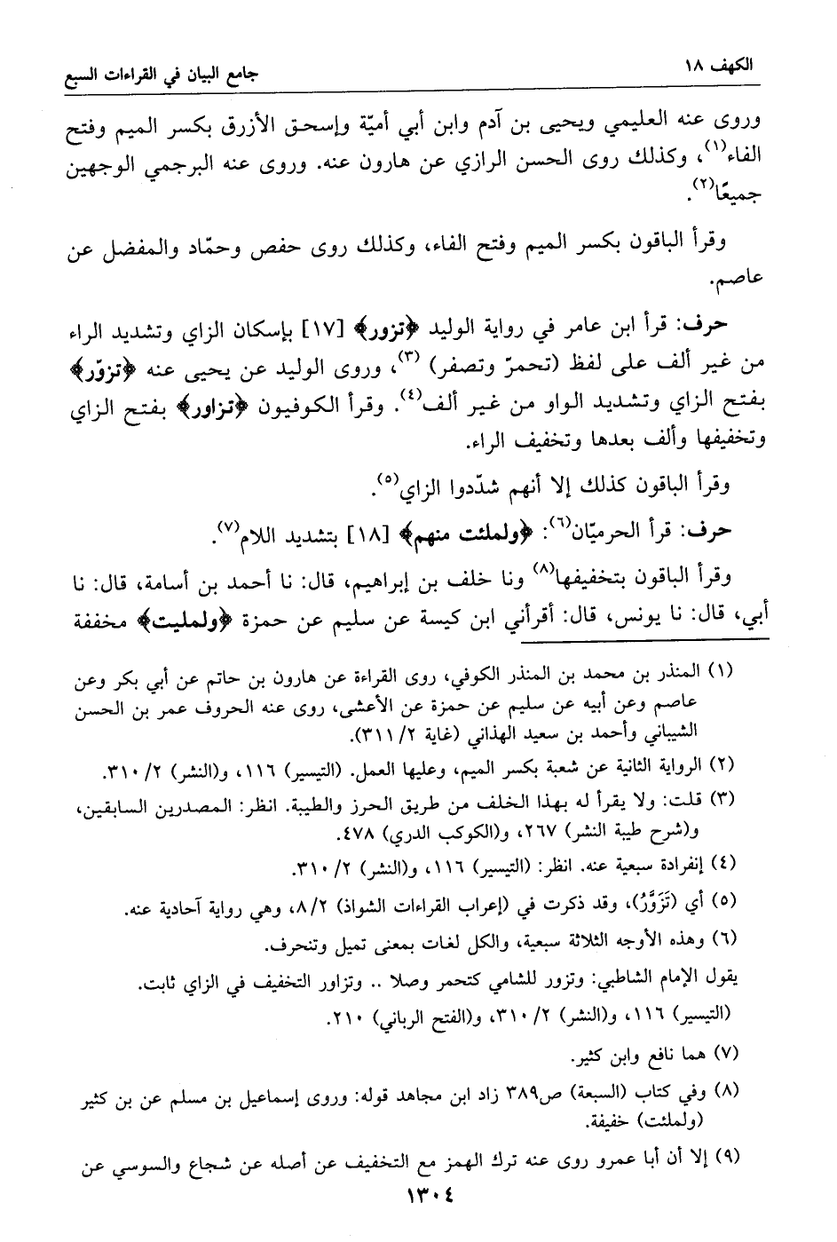 قرأ ابن عامر في رواية الوليد تزور [17] بإسكان الزاي وتشديد الراء من غير ألف على لفظ (تحمرّ وتصفر) «3»، وروى الوليد عن يحيى عنه تزوّر بفتح الزاي وتشديد الواو من غير ألف «4». وقرأ الكوفيون تزاور بفتح الزاي وتخفيفها وألف بعدها وتخفيف الراء.
