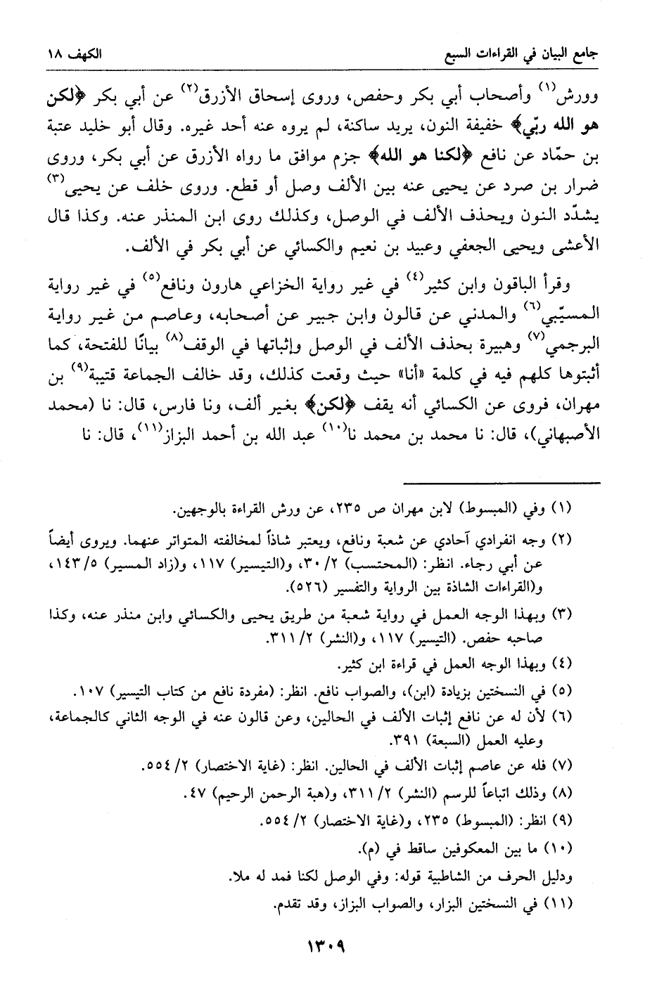 بن حمّاد عن نافع لكنا هو الله جزم موافق ما رواه الأزرق عن أبي بكر، وروى ضرار بن صرد عن يحيى عنه بين الألف وصل أو قطع. وروى خلف عن يحيى «3» يشدّد النون ويحذف الألف في الوصل، وكذلك روى ابن المنذر عنه. وكذا قال الأعشى ويحيى الجعفي وعبيد بن نعيم والكسائي عن أبي بكر في الألف.