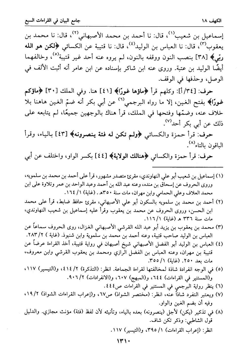 إسماعيل بن شعيب «1»، قال: نا أحمد بن محمد الأصبهاني «2»، قال: نا محمد بن يعقوب «3»، قال: نا العباس بن الوليد «4»، قال: نا قتيبة عن الكسائي لكن هو الله ربّي [38] بنصب النون ووقفه بالنون، لم يروه عنه أحد غير قتيبة «5»، وخالفهما أيضا الوليد بن عتبة. وروى عنه ابن شاكر بإسناده عن ابن عامر أنه أثبت الألف في الوصل، وحذفها في الوقف.