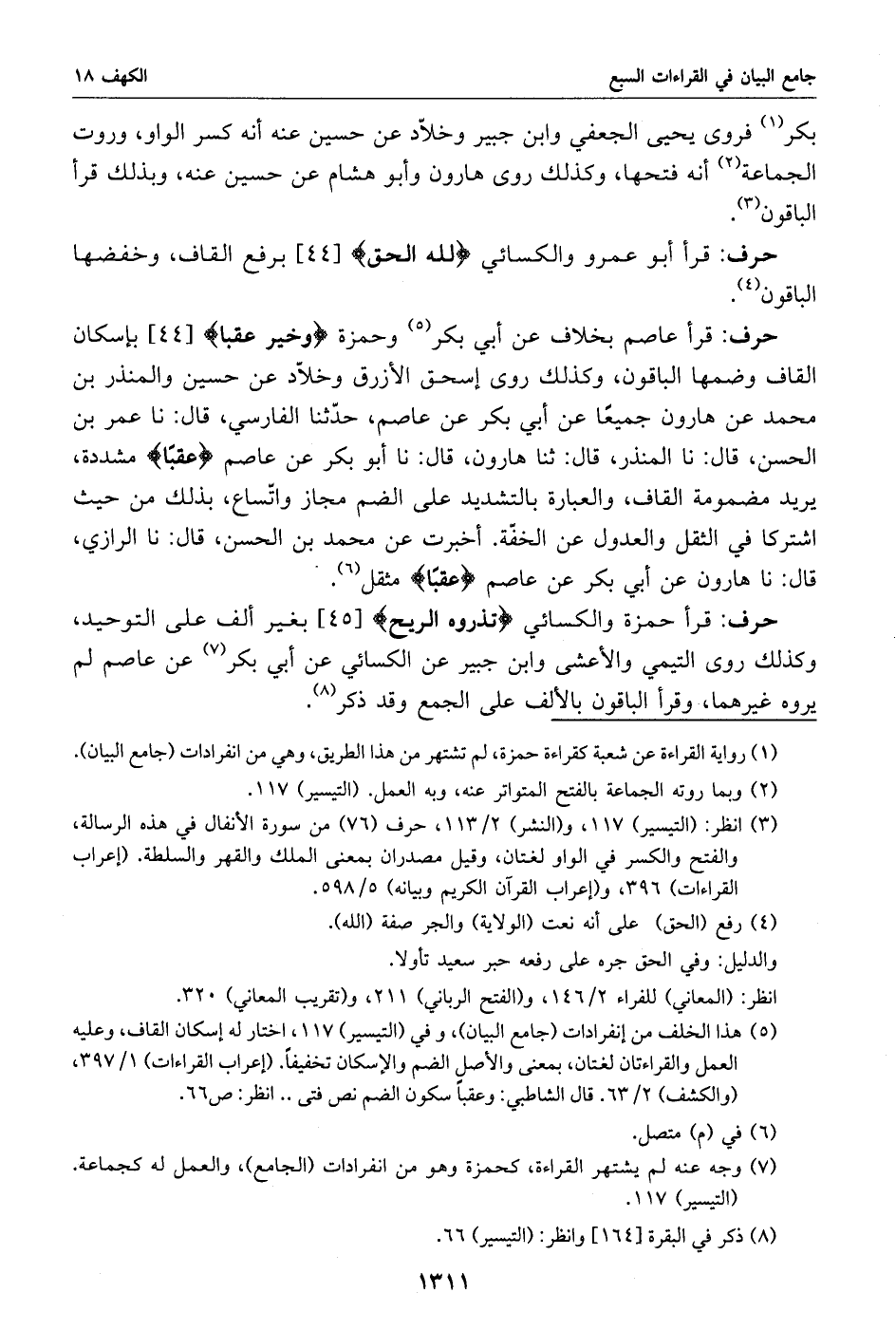 قرأ أبو عمرو والكسائي لله الحق [44] برفع القاف، وخفضها الباقون «4».