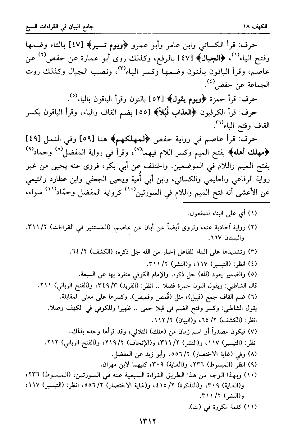 قرأ الكسائي وابن عامر وأبو عمرو ويوم تسير [47] بالتاء وضمها وفتح الياء «1»، الجبال [47] بالرفع، وكذلك روى أبو عمارة عن حفص «2» عن عاصم، وقرأ الباقون بالنون وضمها وكسر الياء «3»، ونصب الجبال وكذلك روت الجماعة عن حفص «4».