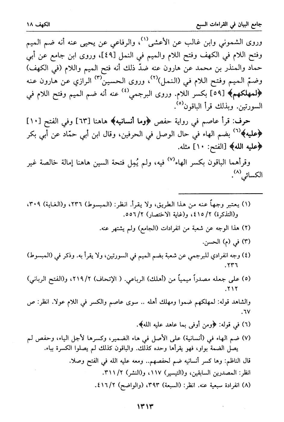 (7) ضم الهاء في (أنسانيه) على الأصل في هاء الضمير، وكسرها لأجل الياء، وحفص لم يصل الضمة بواو، فهو يقرأها وحده كذلك. والباقون كذلك لم يصلوا الكسرة بباء.