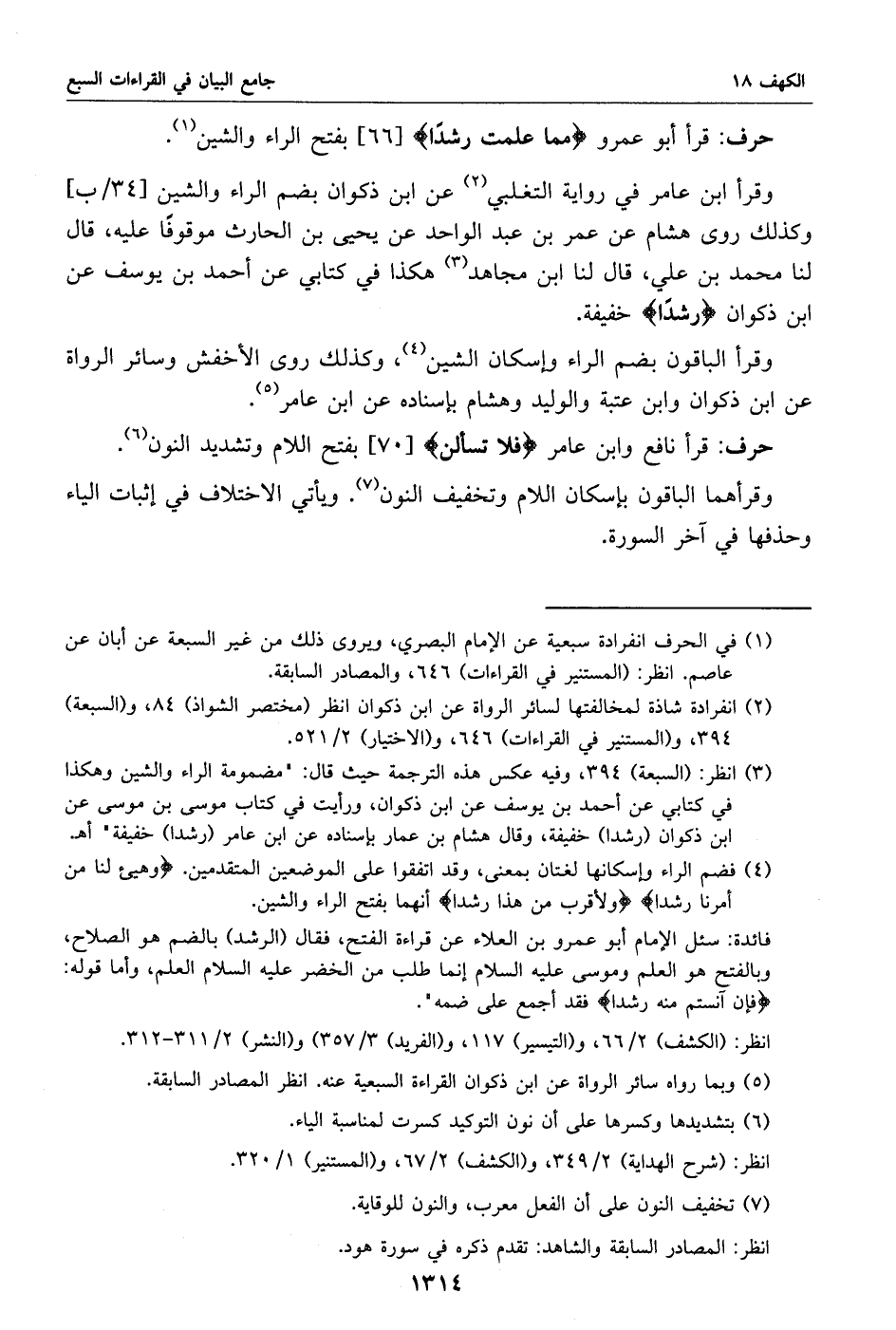 (4) فضم الراء وإسكانها لغتان بمعنى، وقد اتفقوا على الموضعين المتقدمين. وهيئ لنا من أمرنا رشدا ولأقرب من هذا رشدا أنهما بفتح الراء والشين.