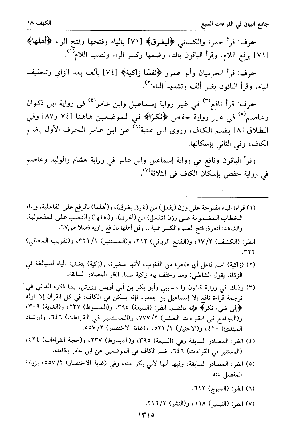 (2) (زاكية) اسم فاعل أي طاهرة من الذنوب، لأنها صغيرة، و (زكية) بتشديد الياء للمبالغة في الزكاة. يقول الشاطبي: ومد وخفف ياء زاكية سما. انظر المصادر السابقة.