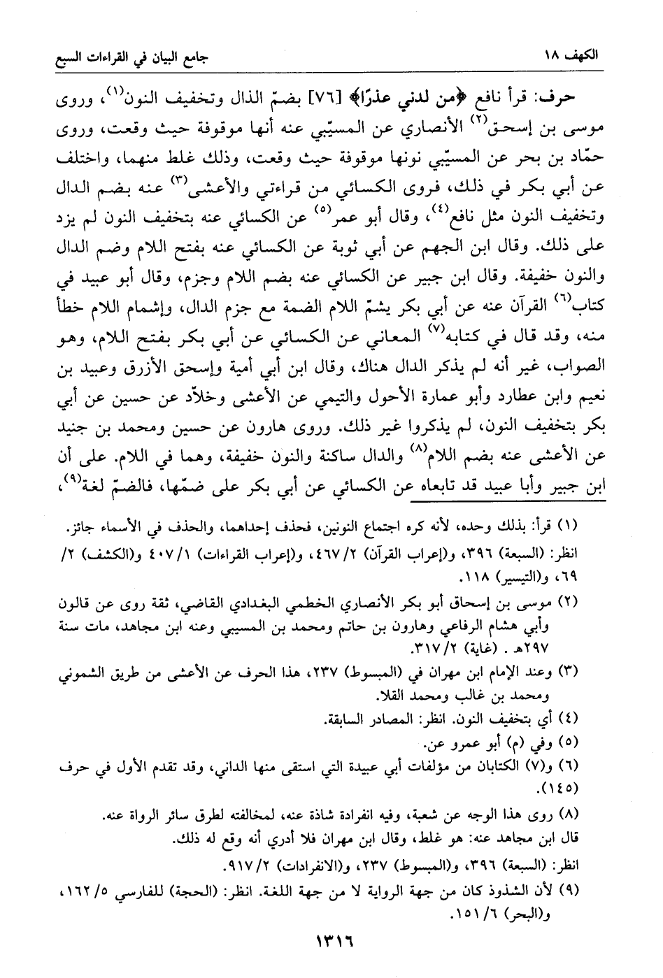 قرأ نافع من لدني عذرا [76] بضمّ الذال وتخفيف النون «1»، وروى موسى بن إسحاق «2» الأنصاري عن المسيّبي عنه أنها موقوفة حيث وقعت، وروى حمّاد بن بحر عن المسيّبي نونها موقوفة حيث وقعت، وذلك غلط منهما، واختلف عن أبي بكر في ذلك، فروى الكسائي من قراءتي والأعشى «3» عنه بضم الدال وتخفيف النون مثل نافع «4»، وقال أبو عمر «5» عن الكسائي عنه بتخفيف النون لم يزد على ذلك. وقال ابن الجهم عن أبي ثوبة عن الكسائي عنه بفتح اللام وضم الدال والنون خفيفة. وقال ابن جبير عن الكسائي عنه بضم اللام وجزم، وقال أبو عبيد في كتاب «6» القرآن عنه عن أبي بكر يشمّ اللام الضمة مع جزم الدال، وإشمام اللام خطأ منه، وقد قال في كتابه «7» المعاني عن الكسائي عن أبي بكر بفتح اللام، وهو الصواب، غير أنه لم يذكر الدال هناك، وقال ابن أبي أمية وإسحاق الأزرق وعبيد بن نعيم وابن عطارد وأبو عمارة الأحول والتيمي عن الأعشى وخلّاد عن حسين عن أبي بكر بتخفيف النون، لم يذكروا غير ذلك. وروى هارون عن حسين ومحمد بن جنيد عن الأعشى عنه بضم اللام «8» والدال ساكنة والنون خفيفة، وهما في اللام. على أن ابن جبير وأبا عبيد قد تابعاه عن الكسائي عن أبي بكر على ضمّها، فالضمّ لغة «9»،