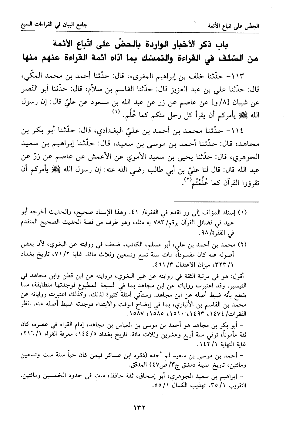 114 - حدّثنا محمد بن أحمد بن عليّ البغدادي، قال: حدّثنا أبو بكر بن مجاهد، قال: حدّثنا أحمد بن موسى بن سعيد، قال: حدّثنا إبراهيم بن سعيد الجوهري، قال: حدّثنا يحيى بن سعيد الأموي عن الأعمش عن عاصم عن زرّ عن عبد الله قال: قال لنا عليّ بن أبي طالب رضي الله عنه: إن رسول الله صلى الله عليه وسلم يأمركم أن تقرءوا القرآن كما علّمتم «2».
