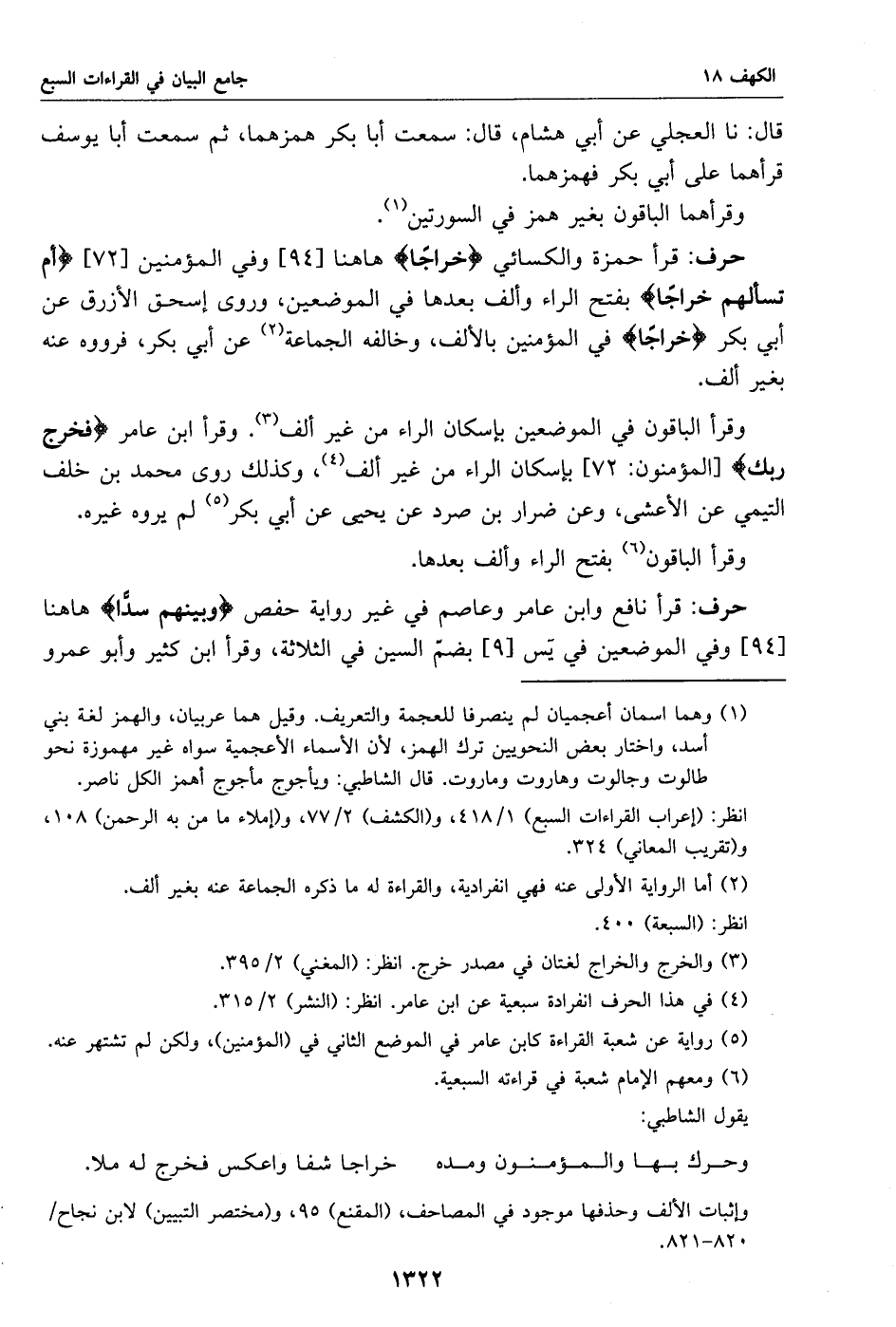 قرأ حمزة والكسائي خراجا هاهنا [94] وفي المؤمنين [72] أم تسألهم خراجا بفتح الراء وألف بعدها في الموضعين، وروى إسحاق الأزرق عن أبي بكر خراجا في المؤمنين بالألف، وخالفه الجماعة «2» عن أبي بكر، فرووه عنه بغير ألف.