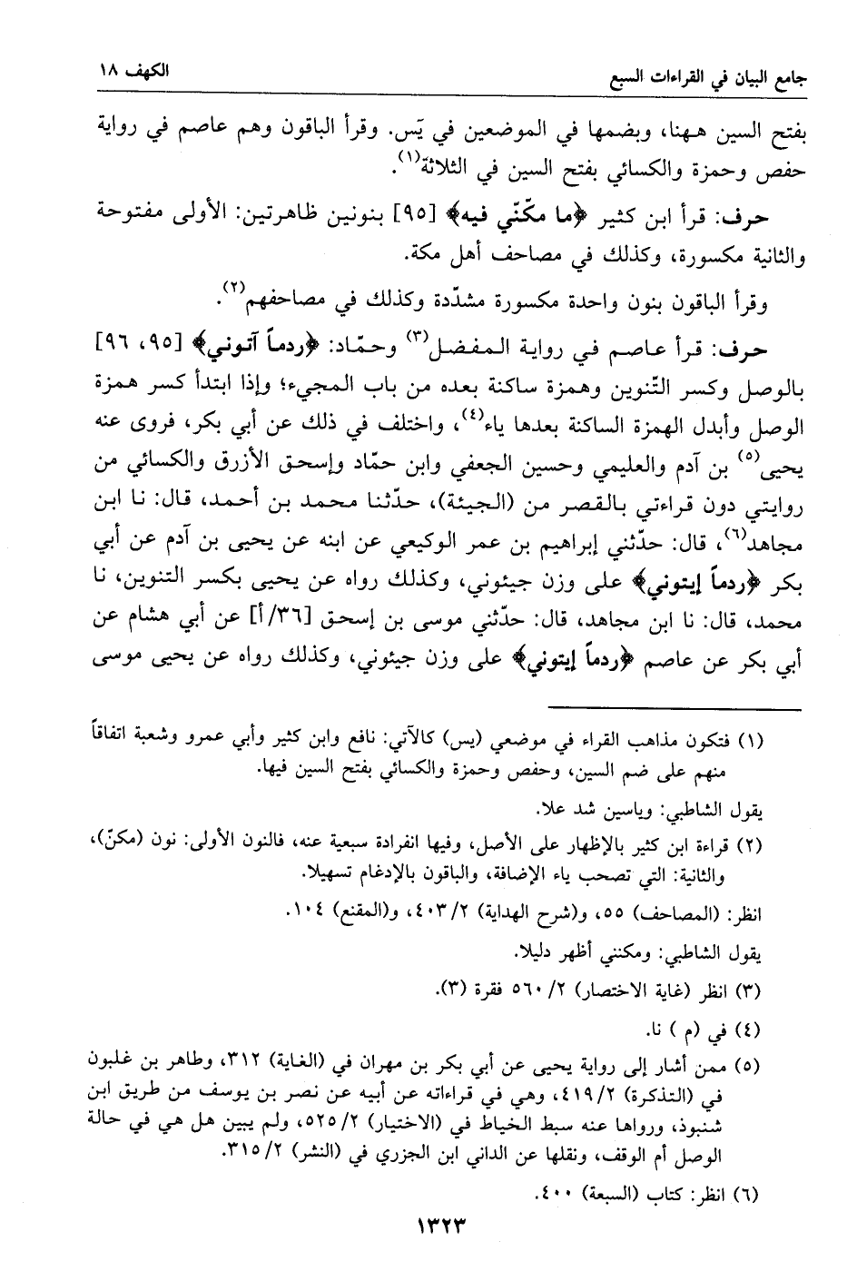 قرأ عاصم في رواية المفضل «3» وحمّاد: ردما آتوني [95، 96] بالوصل وكسر التّنوين وهمزة ساكنة بعده من باب المجيء؛ وإذا ابتدأ كسر همزة الوصل وأبدل الهمزة الساكنة بعدها ياء «4»، واختلف في ذلك عن أبي بكر، فروى عنه يحيى «5» بن آدم والعليمي وحسين الجعفي وابن حمّاد وإسحاق الأزرق والكسائي من روايتي دون قراءتي بالقصر من (الجيئة)، حدّثنا محمد بن أحمد، قال: نا ابن مجاهد «6»، قال: حدّثني إبراهيم بن عمر الوكيعي عن ابنه عن يحيى بن آدم عن أبي بكر ردما إيتوني على وزن جيئوني، وكذلك رواه عن يحيى بكسر التنوين، نا محمد، قال: نا ابن مجاهد، قال: حدّثني موسى بن إسحق [36/ أ] عن أبي هشام عن أبي بكر عن عاصم ردما إيتوني على وزن جيئوني، وكذلك رواه عن يحيى موسى
