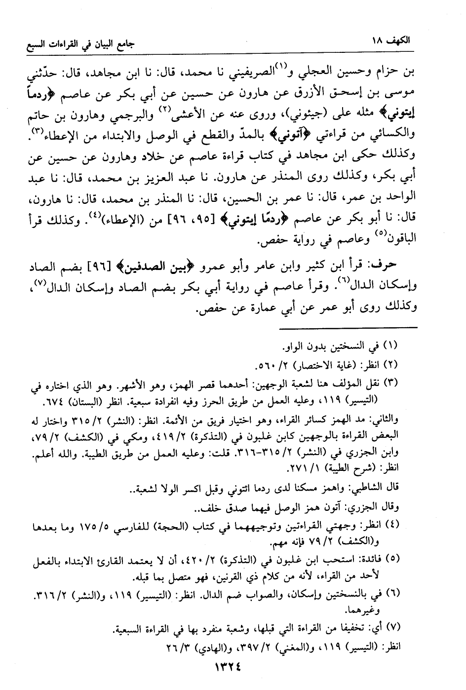 وكذلك حكى ابن مجاهد في كتاب قراءة عاصم عن خلاد وهارون عن حسين عن أبي بكر، وكذلك روى المنذر عن هارون. نا عبد العزيز بن محمد، قال: نا عبد الواحد بن عمر، قال: نا عمر بن الحسين، قال: نا المنذر بن محمد، قال: نا هارون، قال: نا أبو بكر عن عاصم ردما إيتوني [95، 96] من (الإعطاء) «4». وكذلك قرأ الباقون «5» وعاصم في رواية حفص.
