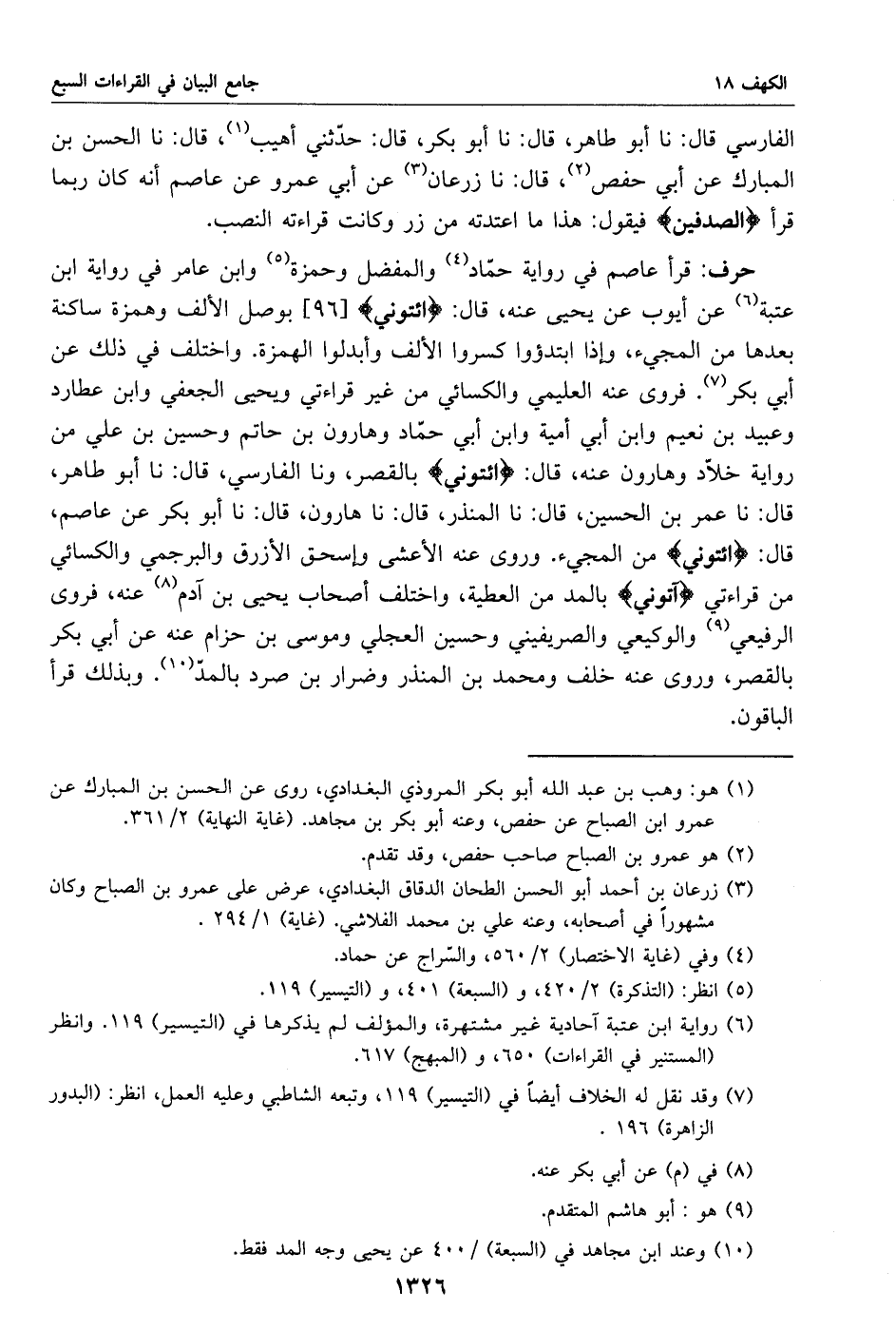 الفارسي قال: نا أبو طاهر، قال: نا أبو بكر، قال: حدّثني أهيب «1»، قال: نا الحسن بن المبارك عن أبي حفص «2»، قال: نا زرعان «3» عن أبي عمرو عن عاصم أنه كان ربما قرأ الصدفين فيقول: هذا ما اعتدته من زر وكانت قراءته النصب.
