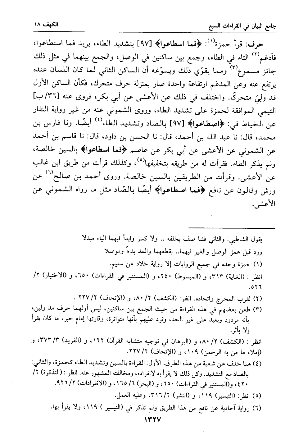 قرأ حمزة «1»: فما اسطاعوا [97] بتشديد الطاء، يريد فما استطاعوا، فأدغم «2» التاء في الطاء، وجمع بين ساكنين في الوصل، والجمع بينهما في مثل ذلك جائز مسموع «3» ومما يقوّي ذلك ويسوّغه أن الساكن الثاني لما كان اللسان عنده يرتفع عنه وعن المدغم ارتفاعة واحدة صار بمنزلة حرف متحرك، فكأن الساكن الأول قد ولي متحركا. واختلف في ذلك عن الأعشى عن أبي بكر، فروى عنه [36/ ب] التيمي الموافقة لحمزة على تشديد الطاء، وروى الشموني عنه من غير رواية النقار عن الخياط في: اصطاعوا [97] بالصاد وتشديد الطاء «4» أيضا. ونا فارس بن محمد، قال: نا عبد الله بن أحمد، قال: نا الحسن بن داود، قال: نا قاسم بن أحمد عن الشموني عن الأعشى عن أبي بكر عن عاصم فما اسطاعوا بالسين خالصة، ولم يذكر الطاء. فقرأت له من طريقه بتخفيفها «5»، وكذلك قرأت من طريق ابن غالب عن الأعشى. وقرأت من الطريقين بالسين خالصة. وروى أحمد بن صالح «6» عن ورش وقالون عن نافع فما اصطاعوا أيضا بالصّاد مثل ما رواه الشموني عن الأعشى.