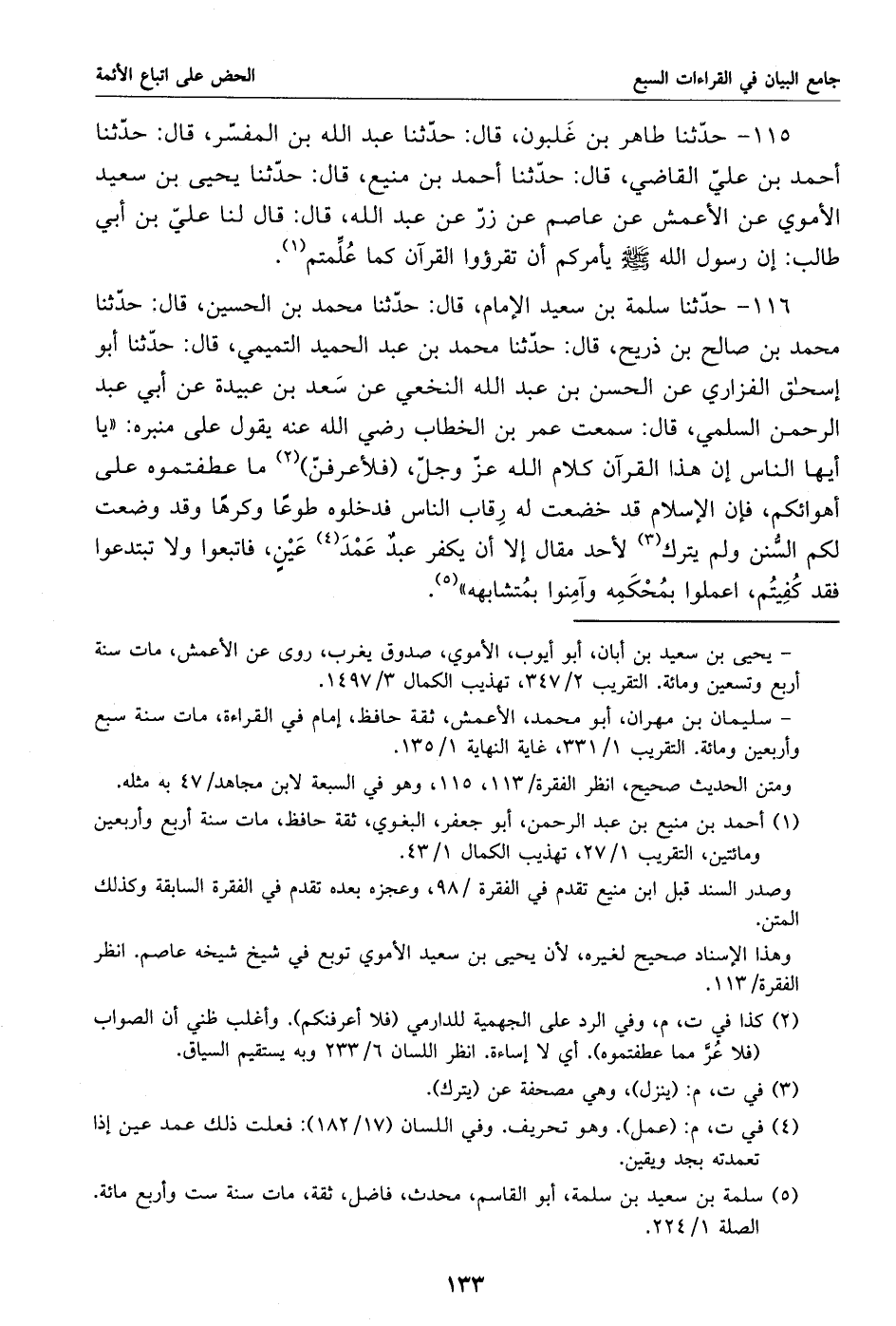 115 - حدّثنا طاهر بن غلبون، قال: حدّثنا عبد الله بن المفسّر، قال: حدّثنا أحمد بن عليّ القاضي، قال: حدّثنا أحمد بن منيع، قال: حدّثنا يحيى بن سعيد الأموي عن الأعمش عن عاصم عن زرّ عن عبد الله، قال: قال لنا عليّ بن أبي طالب: إن رسول الله صلى الله عليه وسلم يأمركم أن تقرءوا القرآن كما علّمتم «1».