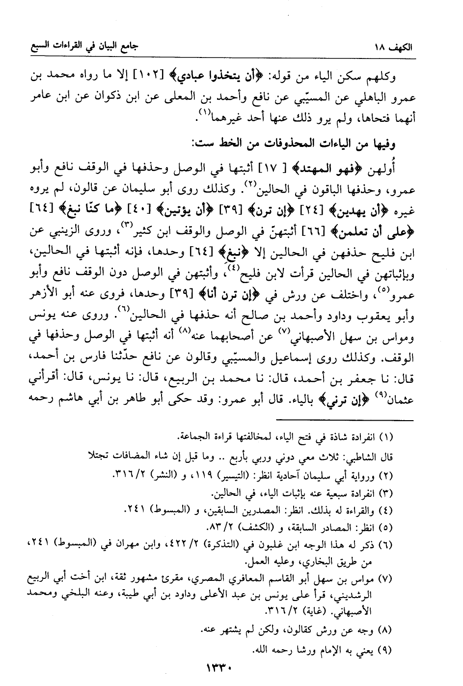 أولهن فهو المهتد [17] أثبتها في الوصل وحذفها في الوقف نافع وأبو عمرو، وحذفها الباقون في الحالين «2». وكذلك روى أبو سليمان عن قالون، لم يروه غيره أن يهدين [24] إن ترن [39] أن يؤتين [40] ما كنّا نبغ [64] على أن تعلمن [66] أثبتهنّ في الوصل والوقف ابن كثير «3»، وروى الزينبي عن ابن فليح حذفهن في الحالين إلا نبغ [64] وحدها، فإنه أثبتها في الحالين، وبإثباتهن في الحالين قرأت لابن فليح «4»، وأثبتهن في الوصل دون الوقف نافع وأبو عمرو «5»، واختلف عن ورش في إن ترن أنا [39] وحدها، فروى عنه أبو الأزهر وأبو يعقوب وداود وأحمد بن صالح أنه حذفها في الحالين «6». وروى عنه يونس ومواس بن سهل الأصبهاني «7» عن أصحابهما عنه «8» أنه أثبتها في الوصل وحذفها في الوقف. وكذلك روى إسماعيل والمسيّبي وقالون عن نافع حدّثنا فارس بن أحمد، قال: نا جعفر بن أحمد، قال: نا محمد بن الربيع، قال: نا يونس، قال: أقرأني عثمان «9» إن ترني بالياء. قال أبو عمرو: وقد حكى أبو طاهر بن أبي هاشم رحمه
