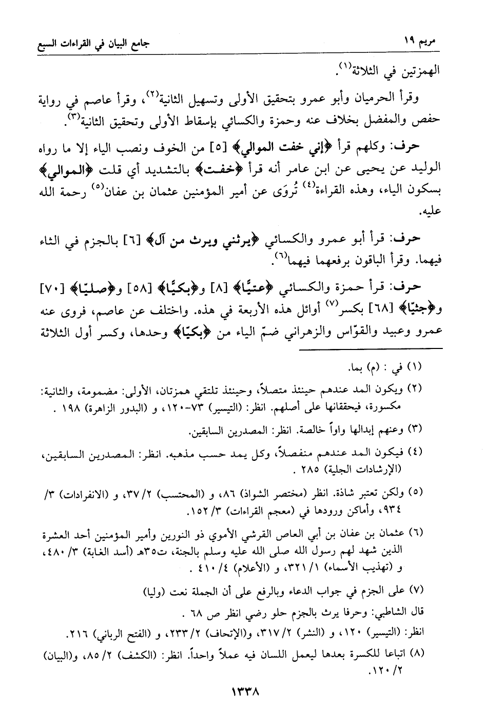 قرأ حمزة والكسائي عتيّا [8] وبكيّا [58] وصليّا [70] وجثيّا [68] بكسر «7» أوائل هذه الأربعة في هذه. واختلف عن عاصم، فروى عنه عمرو وعبيد والقوّاس والزهراني ضمّ الياء من بكيّا وحدها، وكسر أول الثلاثة