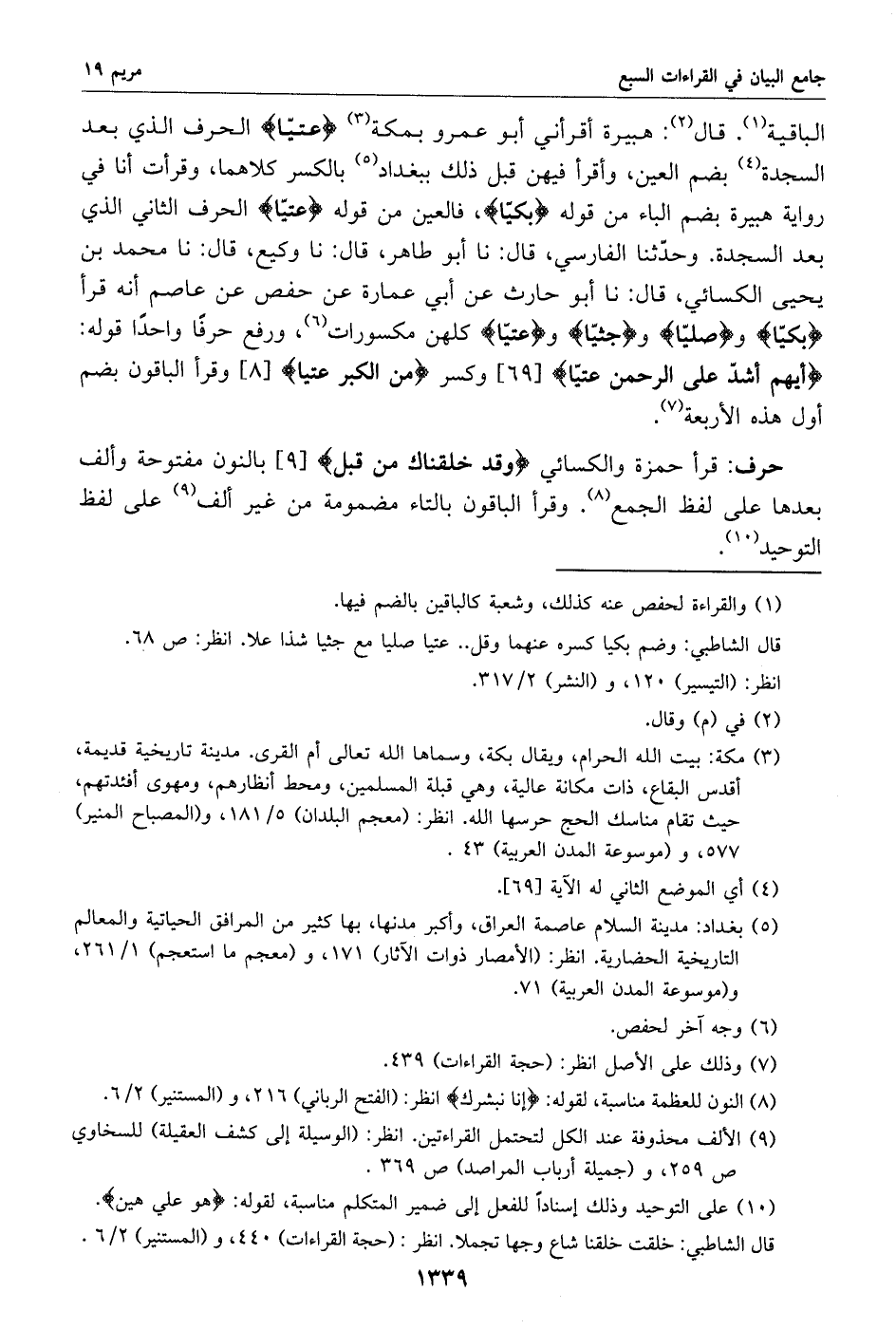 الباقية «1». قال «2»: هبيرة أقرأني أبو عمرو بمكة «3» عتيّا الحرف الذي بعد السجدة «4» بضم العين، وأقرأ فيهن قبل ذلك ببغداد «5» بالكسر كلاهما، وقرأت أنا في رواية هبيرة بضم الباء من قوله بكيّا، فالعين من قوله عتيّا الحرف الثاني الذي بعد السجدة. وحدّثنا الفارسي، قال: نا أبو طاهر، قال: نا وكيع، قال: نا محمد بن يحيى الكسائي، قال: نا أبو حارث عن أبي عمارة عن حفص عن عاصم أنه قرأ بكيّا وصليّا وجثيّا وعتيّا كلهن مكسورات «6»، ورفع حرفا واحدا قوله: