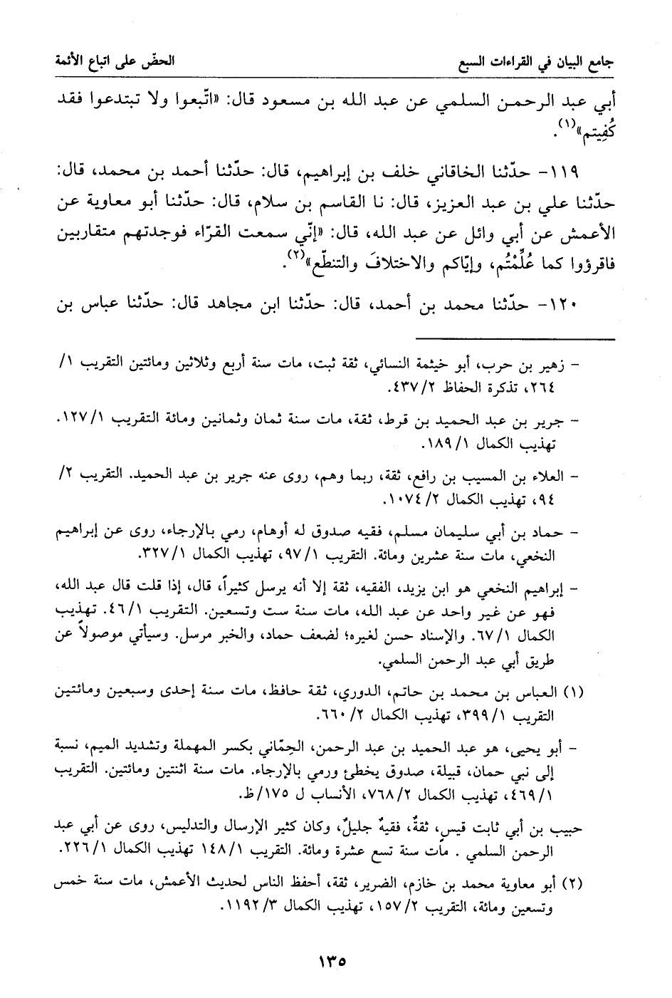 حدّثنا علي بن عبد العزيز، قال: نا القاسم بن سلام، قال: حدّثنا أبو معاوية عن الأعمش عن أبي وائل عن عبد الله، قال: «إنّي سمعت القرّاء فوجدتهم متقاربين فاقرءوا كما علّمتم، وإيّاكم والاختلاف والتنطّع» «2».