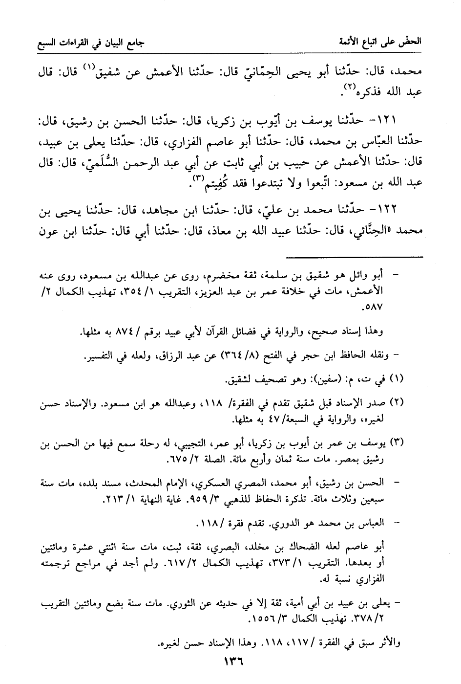 (2) صدر الإسناد قبل شقيق تقدم في الفقرة/ 118، وعبد الله هو ابن مسعود. والإسناد حسن لغيره، والرواية في السبعة/ 47 به مثلها.
