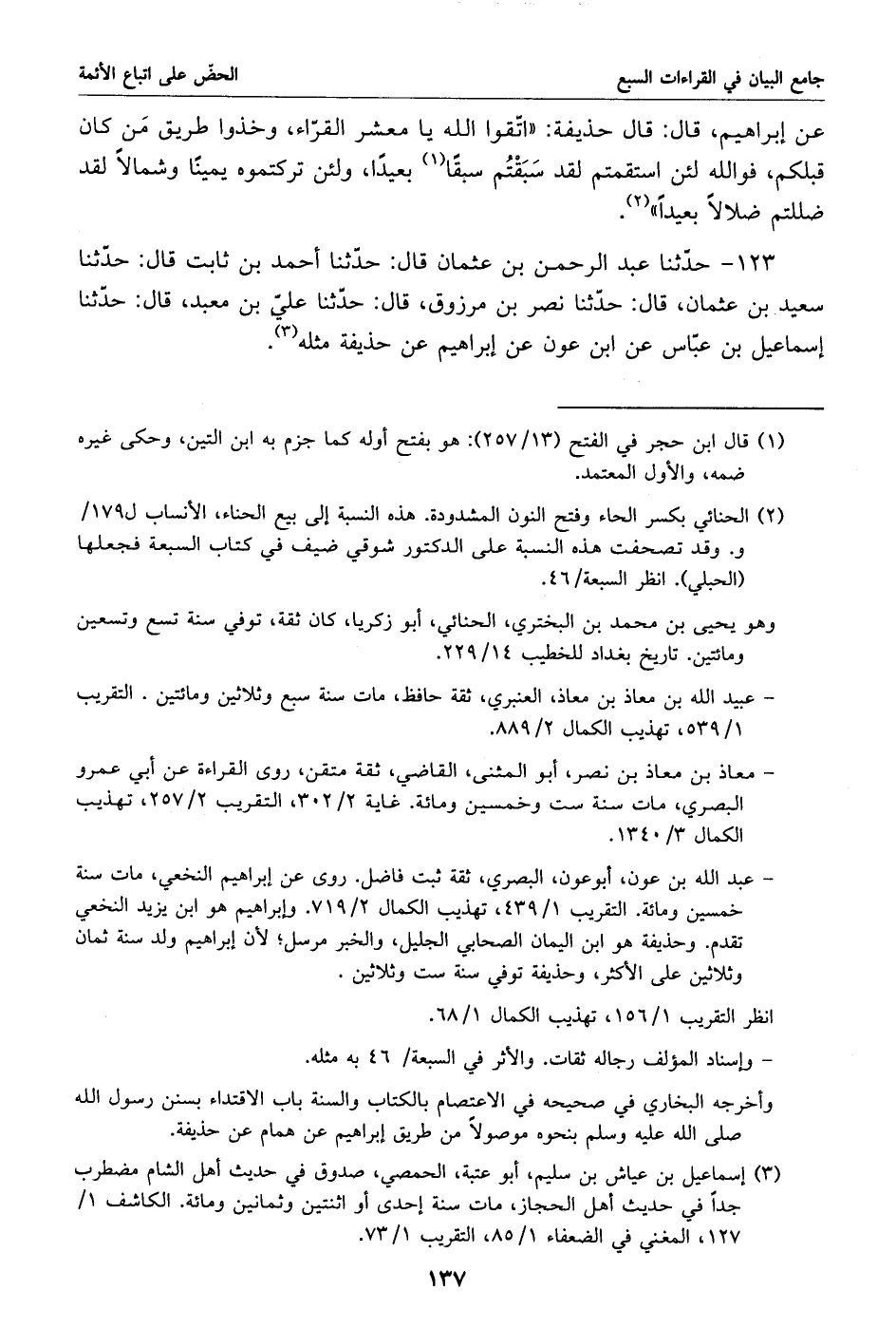 123 - حدّثنا عبد الرحمن بن عثمان قال: حدّثنا أحمد بن ثابت قال: حدّثنا سعيد بن عثمان، قال: حدّثنا نصر بن مرزوق، قال: حدّثنا عليّ بن معبد، قال: حدّثنا إسماعيل بن عبّاس عن ابن عون عن إبراهيم عن حذيفة مثله «3».