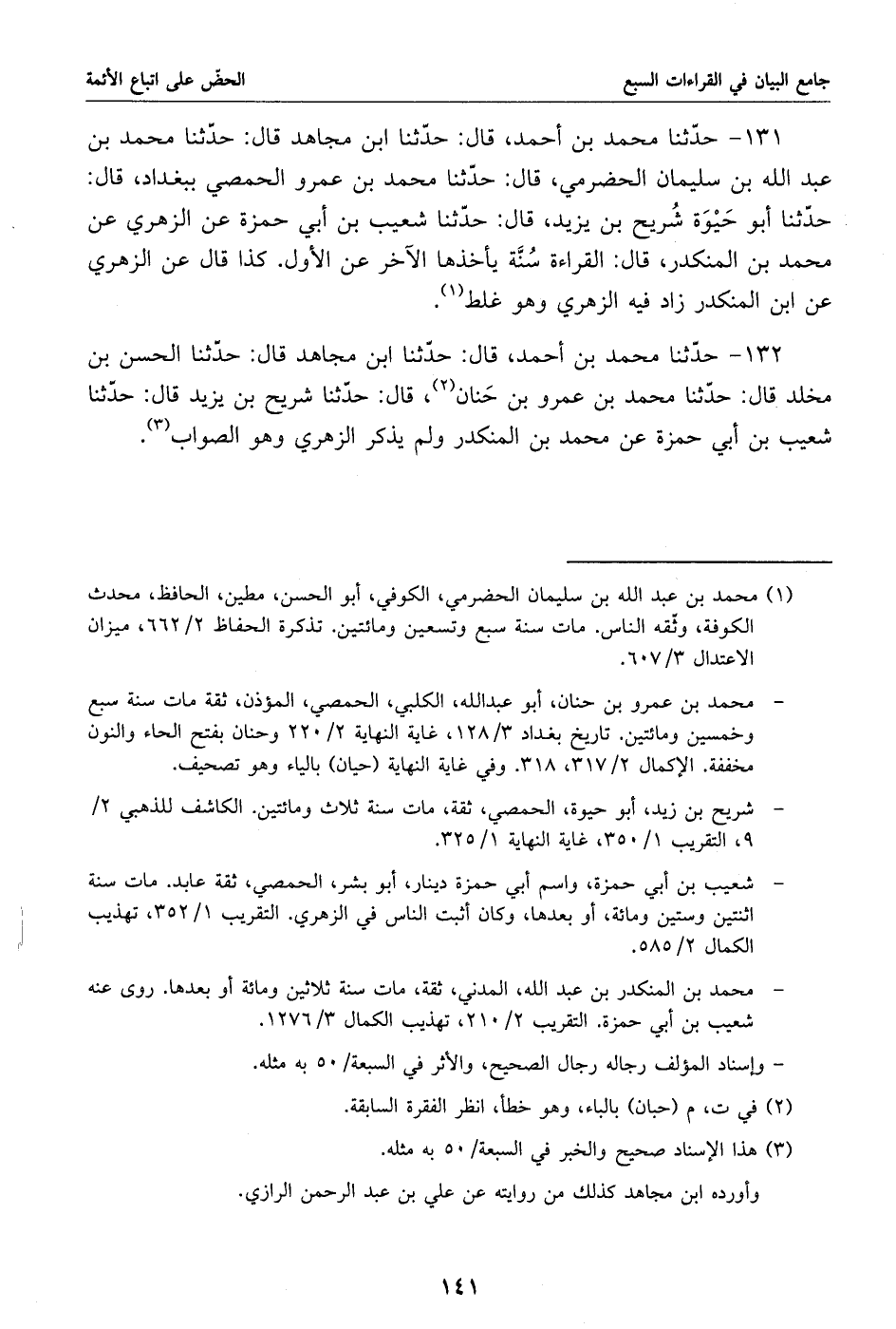 132 - حدّثنا محمد بن أحمد، قال: حدّثنا ابن مجاهد قال: حدّثنا الحسن بن مخلد قال: حدّثنا محمد بن عمرو بن حنان «2»، قال: حدّثنا شريح بن يزيد قال: حدّثنا شعيب بن أبي حمزة عن محمد بن المنكدر ولم يذكر الزهري وهو الصواب «3».